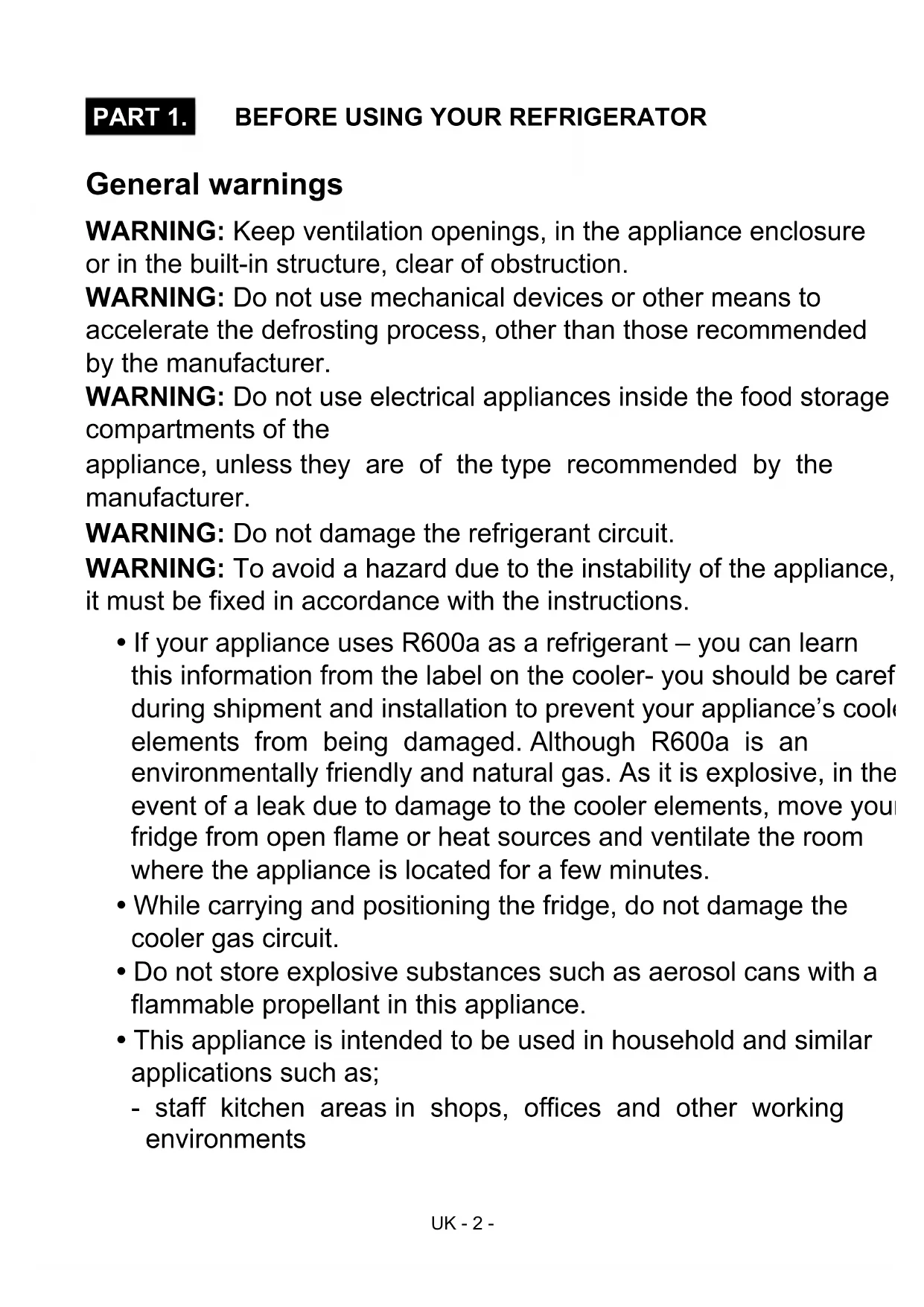 - This appliance is produced to be used in houses and it is only suitable for cooling / storing foods. It is not suitable for commercial or common use and/or for storing substances except for food. Our company is not responsible for the losses to be occurred in the contrary case.UK - 5 -