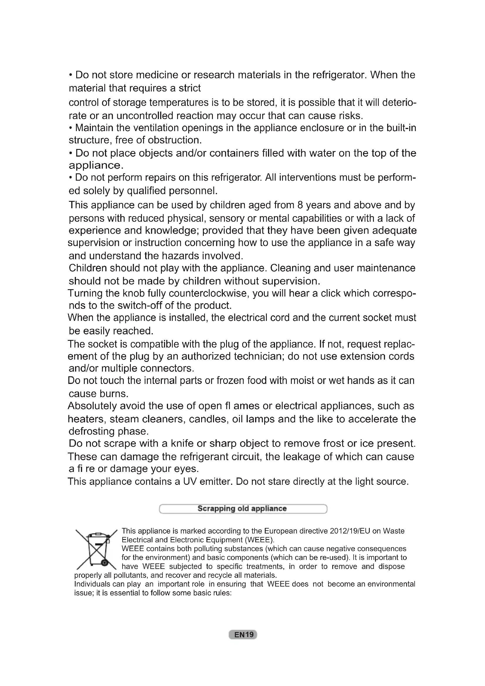 t hands as it can cause burns. ces, such as heaters, steam cleaners, candles, oil lamps and the like to accelerate the defrosting phase. ce present. These can damage the refrigerant circuit, the leakage of which can cause a fi re or damage your eyes.