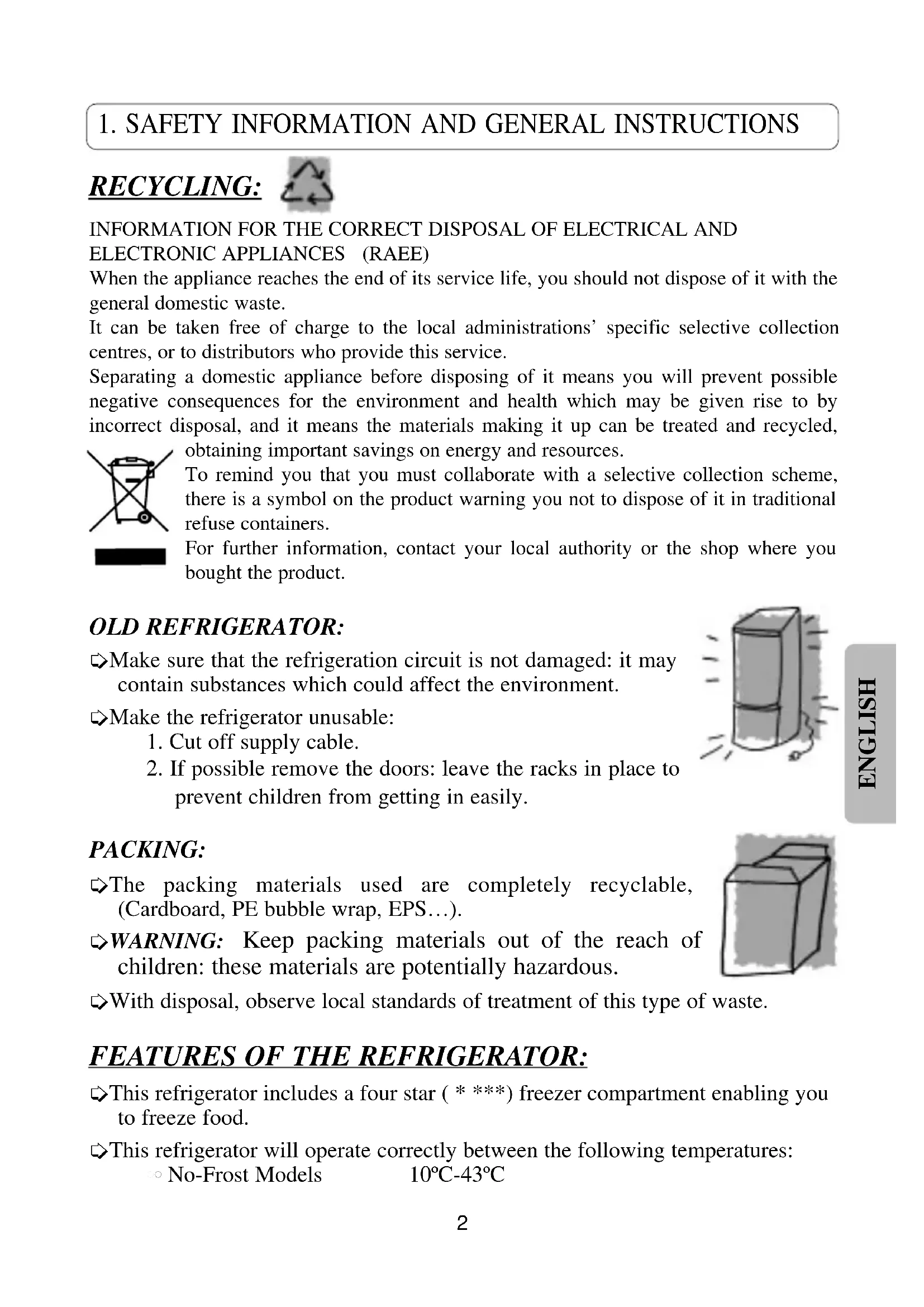 prevent children from getting in easily. PACKING: ➭ The packing materials used are completely recyclable, (Cardboard, PE bubble wrap, EPS…). ➭ WARNING: Keep packing materials out of the reach of children: these materials are potentially hazardous. ➭ With disposal, observe local standards of treatment of this type of waste. FEATURES OF THE REFRIGERATOR: ➭ This refrigerator includes a four star ( * ***) freezer compartment enabling you to freeze food. ➭ This refrigerator will operate correctly between the following temperatures: