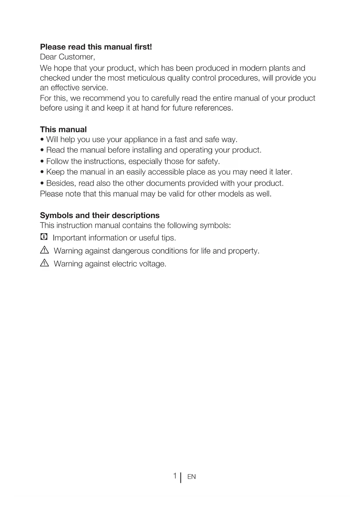 - Besides, read also the other documents provided with your product. Please note that this manual may be valid for other models as well. Symbols and their descriptions This instruction manual contains the following symbols: C Important information or useful tips. A Warning against dangerous conditions for life and property. B Warning against electric voltage.EN