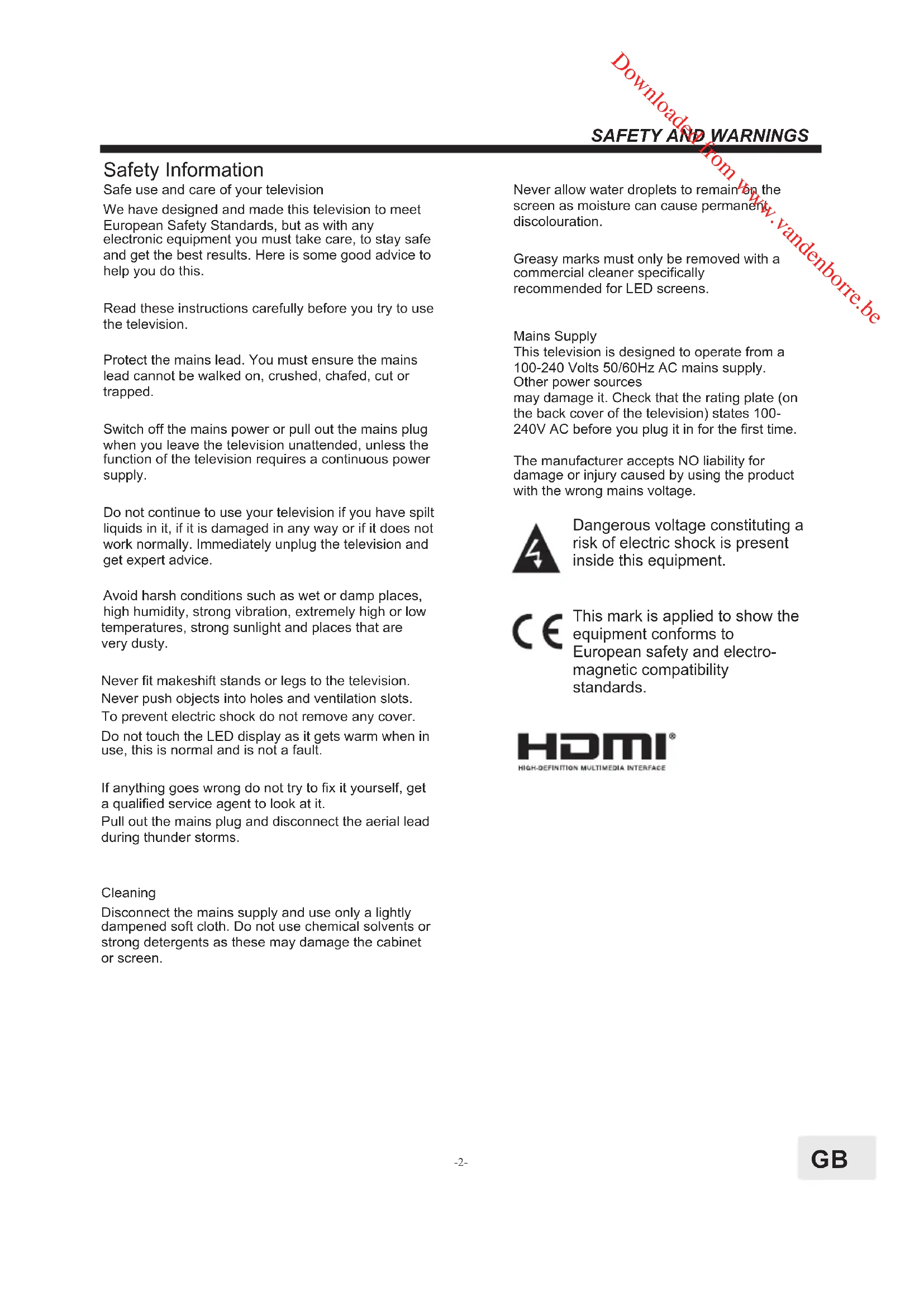 Safety Information Dangerous voltage constituting a risk of electric shock is present inside this equipment. This mark is applied to show the equipment conforms to European safety and electro- magnetic compatibility standards. Safe use and care of your televisionWe have designed and made this television to meet European Safety Standards, but as with any electronic equipment you must take care, to stay safe and get the best results. Here is some good advice to help you do this.Read these instructions carefully before you try to use the television.Protect the mains lead. You must ensure the mains lead cannot be walked on, crushed, chafed, cut or trapped.Switch off the mains power or pull out the mains plug when you leave the television unattended, unless the function of the television requires a continuous power supply.Do not continue to use your television if you have spilt liquids in it, if it is damaged in any way or if it does not work normally. Immediately unplug the television and get expert advice.Avoid harsh conditions such as wet or damp places, high humidity, strong vibration, extremely high or low temperatures, strong sunlight and places that are very dusty.Never fit makeshift stands or legs to the television.Never push objects into holes and ventilation slots.To prevent electric shock do not remove any cover.Do not touch the LED display as it gets warm when in use, this is normal and is not a fault.If anything goes wrong do not try to fix it yourself, get a qualified service agent to look at it.Pull out the mains plug and disconnect the aerial lead during thunder storms.CleaningDisconnect the mains supply and use only a lightly dampened soft cloth. Do not use chemical solvents or strong detergents as these may damage the cabinet or screen.Mains SupplyThis television is designed to operate from a 100-240 Volts 50/60Hz AC mains supply. Other power sourcesmay damage it. Check that the rating plate (on the back cover of the television) states 100-240V AC before you plug it in for the first time.The manufacturer accepts NO liability for damage or injury caused by using the product with the wrong mains voltage.Never allow water droplets to remain on the screen as moisture can cause permanent discolouration.Greasy marks must only be removed with a commercial cleaner specifically recommended for LED screens.