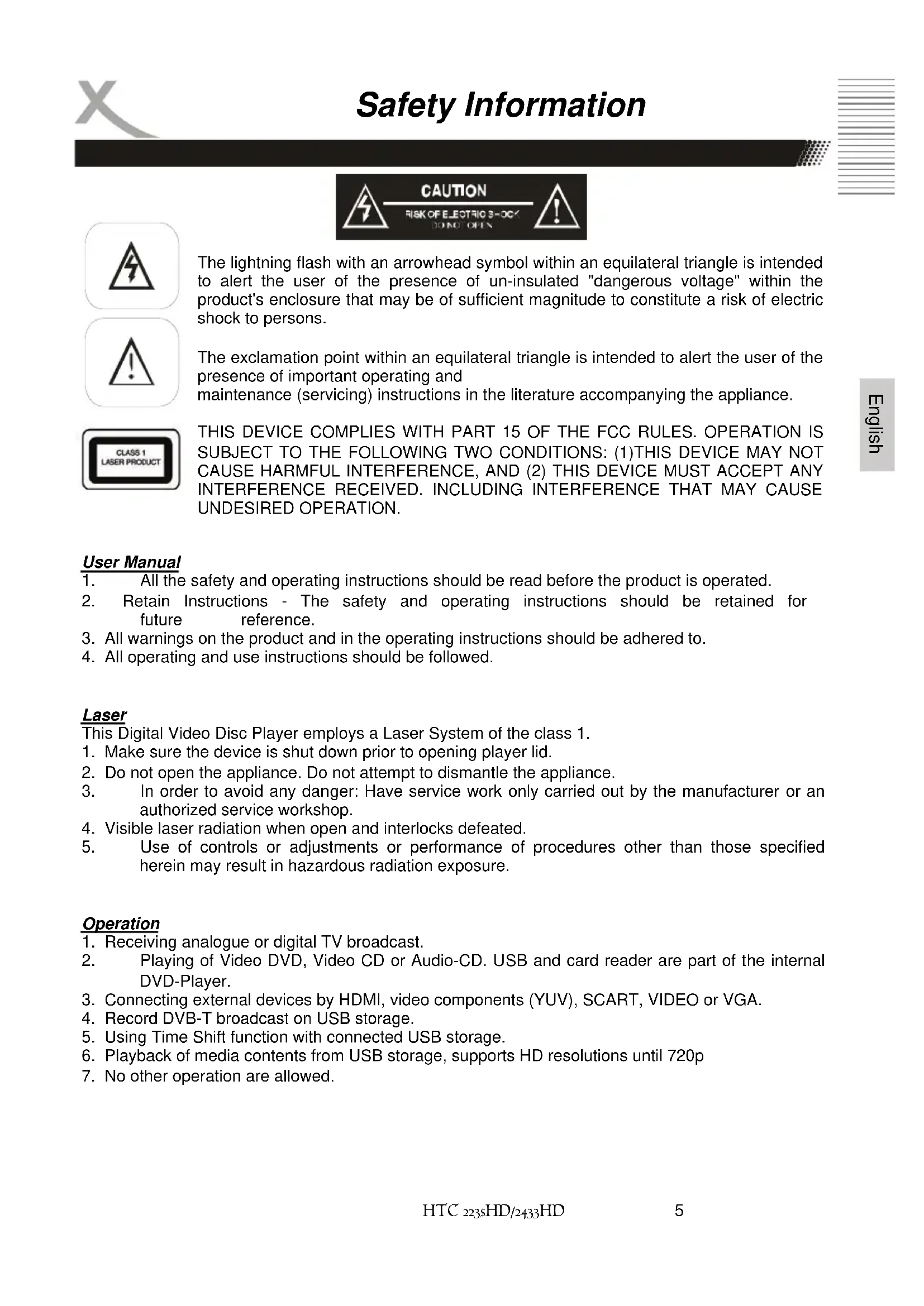 Specification General Specifications......................................................................................... 65 Pixel Errors .......................................................................................................... 65 Media Player: Supported File.............................................................................. 66 Limited Warranty……………………………………………………………………….67HTC 223$HD/2433HD 5 English Safety Information The lightning flash with an arrowhead symbol within an equilateral triangle is intended to alert the user of the presence of un-insulated "dangerous voltage" within the product's enclosure that may be of sufficient magnitude to constitute a risk of electric shock to persons. The exclamation point within an equilateral triangle is intended to alert the user of the presence of important operating and maintenance (servicing) instructions in the literature accompanying the appliance. THIS DEVICE COMPLIES WITH PART 15 OF THE FCC RULES. OPERATION IS SUBJECT TO THE FOLLOWING TWO CONDITIONS: (1)THIS DEVICE MAY NOT CAUSE HARMFUL INTERFERENCE, AND (2) THIS DEVICE MUST ACCEPT ANY INTERFERENCE RECEIVED. INCLUDING INTERFERENCE THAT MAY CAUSE UNDESIRED OPERATION. User Manual