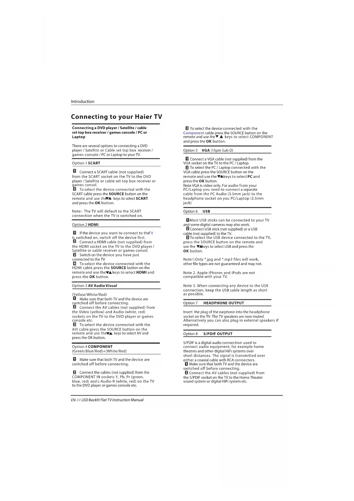 Connect the cables (not supplied) from the COMPONENT IN sockets Y, Pb, Pr (green, blue, red) and L-Audio-R (white, red) on the TV to the DVD player or games console etc. To select the device connected with the cable press the SOURCE button on the remote and use the▼▲ keys to select COMPONENT and press the OK button. Option 5 VGA (15pin Sub-D) Connect a VGA cable (not supplied) from the VGA socket on the TV to the PC / Laptop. To select the PC / Laptop connected with the VGA cable press the SOURCE button on the remote and use the keys to select PC and press the OK button. Note VGA is video only. For audio from your PC/Laptop you need to connect a separate cable from the PC Audio (3.5mm jack) to the headphone socket on you PC/Laptop (3.5mm jack) Option 6 USB Most USB sticks can be connected to your TV and some digital cameras may also work. Connect USB stick (not supplied) or a USB cable (not supplied) to the TV. To select the USB device connected to the TV, press the SOURCE button on the remote and use the keys to select USB and press the OK button. Note1:Only *.jpg and *.mp3 files will work, other file types are not guaranteed and may not. Note 2. Apple iPhones and iPods are not compatible with your TV. Note 3. When connecting any device to the USB connection, keep the USB cable length as short as possible. Option 7 Option 8 Component HEADPHONE OUTPUT