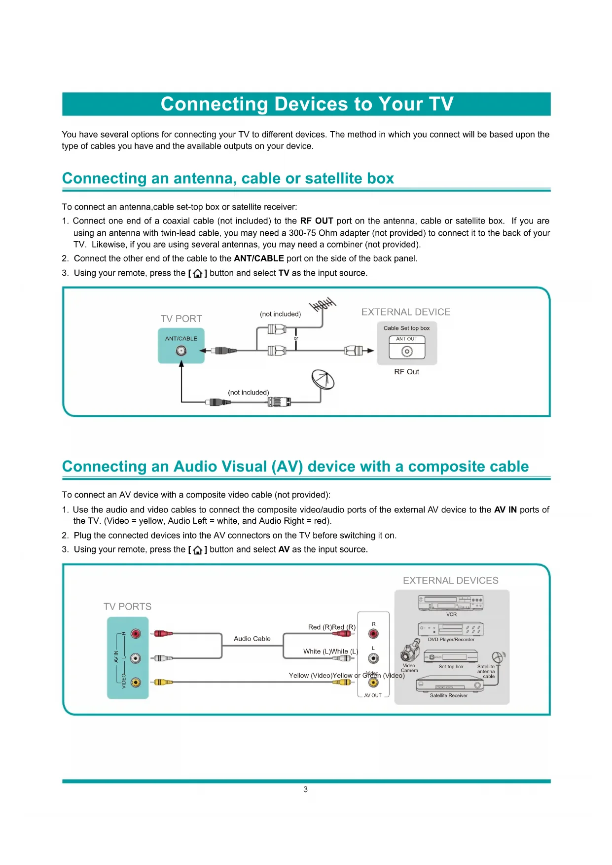 White (L)White (L)Yellow (Video)Yellow or Green (Video)Red (R)Red (R)Audio Cable TV PORTS VIDEO AV IN EXTERNAL DEVICES DVD Player/RecorderVideo CameraSet-top boxSatellite ReceiverSatellite antenna cable VCR4 Connecting an AV device with an HDMI cable This type of connection supports digital connections between HDMI-enabled AV devices such as a Personal Video Recorder (PVR), DVD, Blu-Ray, AV receiver and digital devices. In addition, some devices (such as a PVR or DVD player) require an HDMI signal to be set to Output in the settings of the device. For instructions, please refer to the User Manual for the device. To connect an AV device with an HDMI cable (not provided):