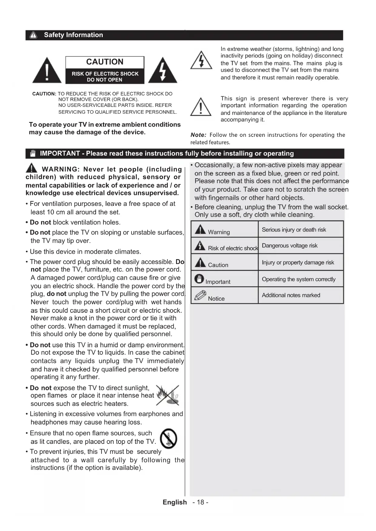 - Do not expose the TV to direct sunlight, open flames or place it near intense heat sources such as electric heaters.