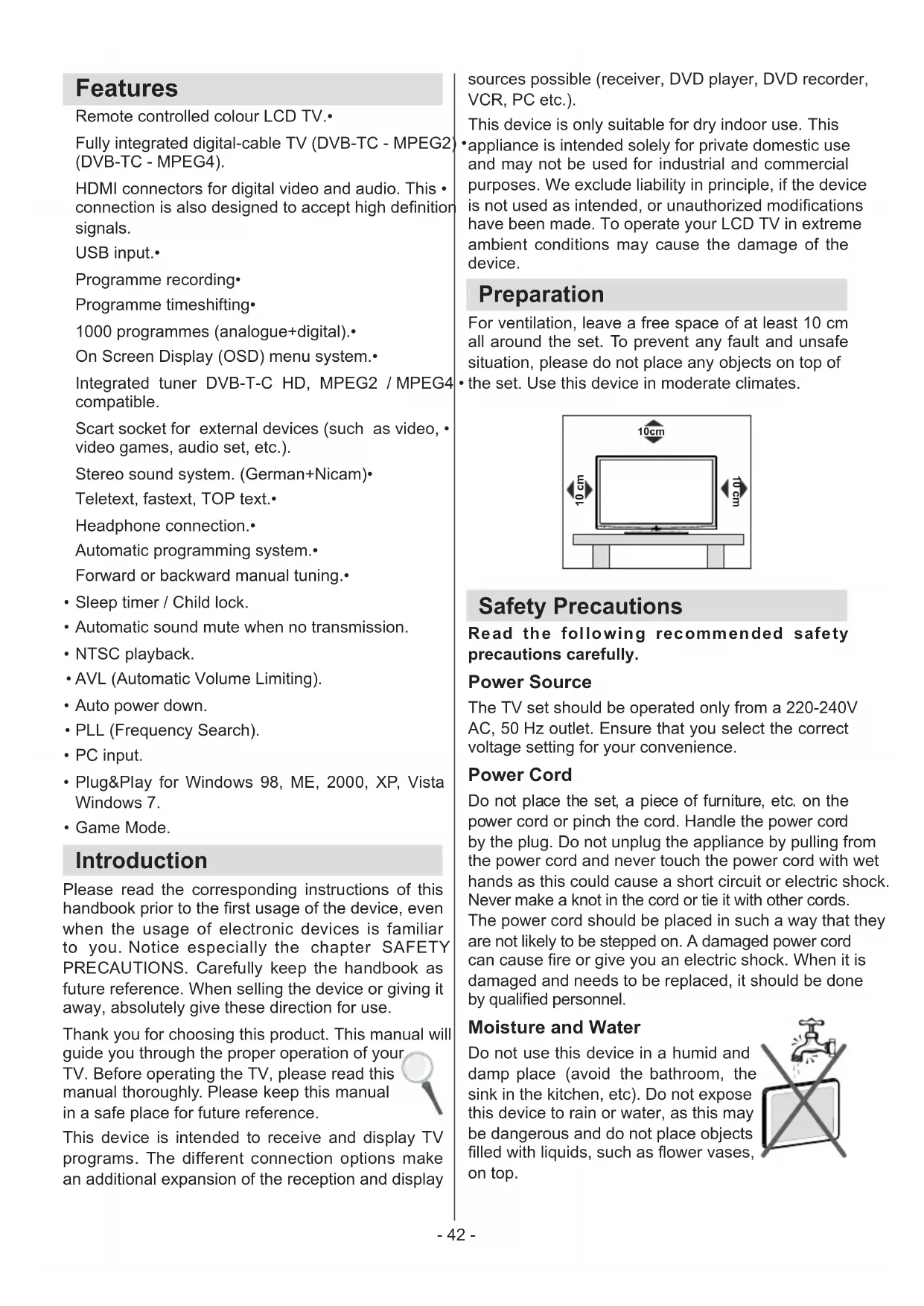 - Digital Reception (DVB-C) - 42 - Features Remote controlled colour LCD TV.• Fully integrated digital-cable TV (DVB-TC - MPEG2) • (DVB-TC - MPEG4). HDMI connectors for digital video and audio. This • connection is also designed to accept high denition signals. USB input.• Programme recording• Programme timeshifting• 1000 programmes (analogue+digital).• On Screen Display (OSD) menu system.• Integrated tuner DVB-T-C HD, MPEG2 / MPEG4 • compatible. Scart socket for external devices (such as video, • video games, audio set, etc.). Stereo sound system. (German+Nicam)• Teletext, fastext, TOP text.• Headphone connection.• Automatic programming system.• Forward or backward manual tuning.• Sleep timer / Child lock.• Automatic sound mute when no transmission.• NTSC playback.• AVL (Automatic Volume Limiting).• Auto power down.• PLL (Frequency Search).• PC input.• Plug&Play for Windows 98, ME, 2000, XP, Vista • Windows 7. Game Mode.• Introduction Please read the corresponding instructions of this handbook prior to the rst usage of the device, even when the usage of electronic devices is familiar to you. Notice especially the chapter SAFETY PRECAUTIONS. Carefully keep the handbook as future reference. When selling the device or giving it away, absolutely give these direction for use. Thank you for choosing this product. This manual will guide you through the proper operation of your TV. Before operating the TV, please read this manual thoroughly. Please keep this manual in a safe place for future reference. This device is intended to receive and display TV programs. The different connection options make an additional expansion of the reception and display sources possible (receiver, DVD player, DVD recorder, VCR, PC etc.). This device is only suitable for dry indoor use. This appliance is intended solely for private domestic use and may not be used for industrial and commercial purposes. We exclude liability in principle, if the device is not used as intended, or unauthorized modications have been made. To operate your LCD TV in extreme ambient conditions may cause the damage of the device. Preparation For ventilation, leave a free space of at least 10 cm all around the set. To prevent any fault and unsafe situation, please do not place any objects on top of the set. Use this device in moderate climates. 10 cm 10 cm 10 cm Safety Precautions Read the following recommended safety precautions carefully. Power Source The TV set should be operated only from a 220-240V AC, 50 Hz outlet. Ensure that you select the correct voltage setting for your convenience. Power Cord Do not place the set, a piece of furniture, etc. on the power cord or pinch the cord. Handle the power cord by the plug. Do not unplug the appliance by pulling from the power cord and never touch the power cord with wet hands as this could cause a short circuit or electric shock. Never make a knot in the cord or tie it with other cords. The power cord should be placed in such a way that they are not likely to be stepped on. A damaged power cord can cause re or give you an electric shock. When it is damaged and needs to be replaced, it should be done by qualied personnel. Moisture and Water Do not use this device in a humid and damp place (avoid the bathroom, the sink in the kitchen, etc). Do not expose this device to rain or water, as this may be dangerous and do not place objects lled with liquids, such as ower vases, on top.- 43 - If any solid object or liquid falls into the cabinet, unplug the TV and have it checked by qualied personnel before operating it any further. Cleaning Before cleaning, unplug the TV set from the wall outlet. Do not use liquid or aerosol cleaners. Use a soft and dry cloth. Ventilation The slots and openings on the TV set are intended for ventilation and to ensure reliable operation. To prevent overheating, these openings must not be blocked or covered in anyway. Heat and Flames The set should not be placed near to open ames or sources of intense heat such as an electric heater. Ensure that no open ame sources, such as candles, are placed on top of the TV. Batteries should not be exposed to excessive heat such as sunshine, re or the like. Lightning In case of storm and lightning or when going on holiday, disconnect the power cord from the wall outlet. Replacement Parts When replacement parts are required, make sure that the service technician has used replacement parts, which are specied by the manufacturer or have the same specications as the original one. Unauthorized substitutions may result in re, electrical shock or other hazards. Servicing Please refer all servicing to qualied personnel. Do not remove the cover yourself as this may result in an electric shock. Waste Disposal Instructions for waste disposal: p. 76