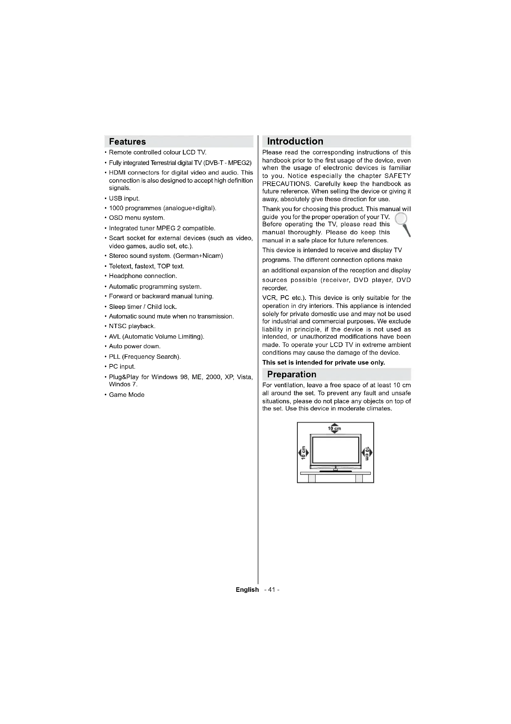 - Speci cations English - 41 - Features Remote controlled colour LCD TV.• Fully integrated Terrestrial digital TV (DVB-T - MPEG2) • HDMI connectors for digital video and audio. This • connection is also designed to accept high de nition signals. USB input.• 1000 programmes (analogue+digital).• OSD menu system.• Integrated tuner MPEG 2 compatible.• Scart socket for external devices (such as video, • video games, audio set, etc.). Stereo sound system. (German+Nicam)• Teletext, fastext, TOP text.• Headphone connection.• Automatic programming system.• Forward or backward manual tuning.• Sleep timer / Child lock.• Automatic sound mute when no transmission.• NTSC playback. • AVL (Automatic Volume Limiting).• Auto power down.• PLL (Frequency Search).• PC input. • Plug&Play for Windows 98, ME, 2000, XP, Vista, • Windos 7. Game Mode • Introduction Please read the corresponding instructions of this handbook prior to the rst usage of the device, even when the usage of electronic devices is familiar to you. Notice especially the chapter SAFETY PRECAUTIONS. Carefully keep the handbook as future reference. When selling the device or giving it away, absolutely give these direction for use. Thank you for choosing this product. This manual will guide you for the proper operation of your TV. Before operating the TV, please read this manual thoroughly. Please do keep this manual in a safe place for future references. This device is intended to receive and display TV programs. The different connection options make an additional expansion of the reception and display sources possible (receiver, DVD player, DVD recorder, VCR, PC etc.). This device is only suitable for the operation in dry interiors. This appliance is intended solely for private domestic use and may not be used for industrial and commercial purposes. We exclude liability in principle, if the device is not used as intended, or unauthorized modi cations have been made. To operate your LCD TV in extreme ambient conditions may cause the damage of the device. This set is intended for private use only. Preparation For ventilation, leave a free space of at least 10 cm all around the set. To prevent any fault and unsafe situations, please do not place any objects on top of the set. Use this device in moderate climates.English - 42 - Safety Precautions Read the following recommended safety precautions carefully for your safety. Power Source The TV set should be operated only from a 220-240 V AC, 50 Hz outlet. Ensure that you select the correct voltage setting for your convenience. Power Cord Do not place the set, a piece of furniture, etc. on the power cord (mains lead) or pinch the cord. Handle the power cord by the plug. Do not unplug the appliance by pulling from the power cord and never touch the power cord with wet hands as this could cause a short circuit or electric shock. Never make a knot in the cord or tie it with other cords. The power cords should be placed in such a way that they are not likely to be stepped on. A damaged power cord can cause re or give you an electric shock. When it is damaged and needs to be replaced, it should be done by quali ed personnel. Moisture and Water Do not use this device in a humid and damp place (avoid the bathroom, the sink in the kitchen, and near the washing machine). Do not expose this device to rain or water, as this may be dangerous and do not place objects filled with liquids, such as ower vases, on top. Avoid from dripping or splashing. If any solid object or liquid falls into the cabinet, unplug the TV and have it checked by quali ed personnel before operating it any further. Cleaning Before cleaning, unplug the TV set from the wall outlet. Do not use liquid or aerosol cleaners. Use soft and dry cloth. Ventilation The slots and openings on the TV set are intended for ventilation and to ensure reliable operation. To prevent overheating, these openings must not be blocked or covered in anyway. Heat and Flames The set should not be placed near to open ames and sources of intense heat such as an electric heater. Ensure that no open ame sources, such as lighted candles, are placed on top of the TV. Batteries should not be exposed to excessive heat such as sunshine, re or the like. Lightning In case of storm and lightning or when going on holiday, disconnect the power cord from the wall outlet. Replacement Parts When replacement parts are required, make sure that the service technician has used replacement parts, which are speci ed by the manufacturer or have the same speci cations as the original one. Unauthorized substitutions may result in re, electrical shock or other hazards. Servicing Please refer all servicing to quali ed personnel. Do not remove the cover yourself as this may result in an electric shock. Waste Disposal Instructions for waste disposal:• Packaging and packaging aids are recyclable and should principally be recycled. Packaging materials, such as foil bag, must be kept away from children. Batteries, including those which are heavy metal-free, should not be disposed of with household waste. Please dispose of used battery in an environment friendly manner. Find out about the legal regulations which apply in your area. Don’t try to recharge batteries. Danger of explosion. • Replace batteries only with the same or equivalent type. Information for Users on Disposal of old Equipment and Batteries [European Union only] These symbols indicate that equipment with these symbols should not be disposed of as general household waste. If you want to dispose of the product or battery, please consider the collection systems or facilities for appropriate recycling. For more information, please contact the local authority or the dealer where you purchased the product. Disconnecting the Device The mains plug is used to disconnect TV set from the mains and therefore it must remain readily operable. Headphone Volume Excessive sound pressure from earphones 