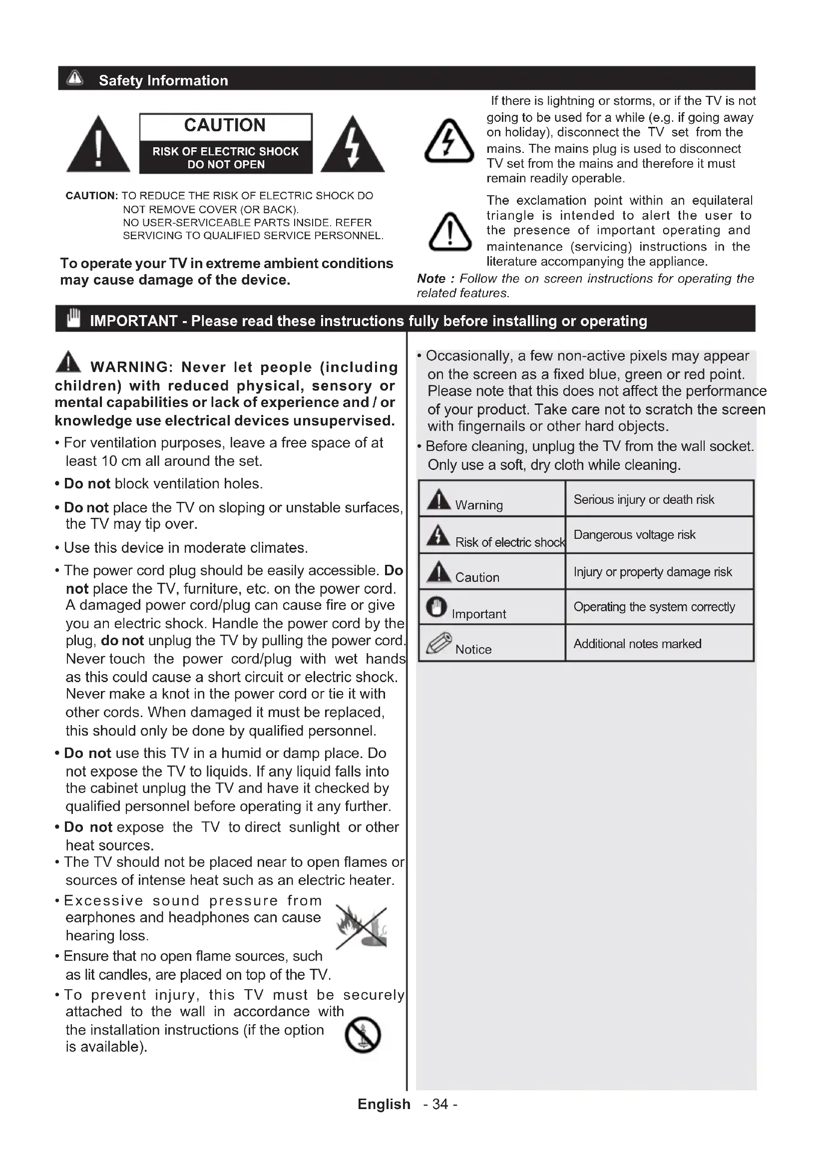 - Before cleaning, unplug the TV from the wall socket. Only use a soft, dry cloth while cleaning. Warning Serious injury or death risk Risk of electric shock Dangerous voltage risk Caution Injury or property damage risk Important Operating the system correctly Notice Additional notes marked If there is lightning or storms, or if the TV is not going to be used for a while (e.g. if going away on holiday), disconnect the TV set from the mains. The mains plug is used to disconnect TV set from the mains and therefore it must remain readily operable. The exclamation point within an equilateral triangle is intended to alert the user to the presence of important operating and maintenance (servicing) instructions in the literature accompanying the appliance. IMPORTANT - Please read these instructions fully before installing or operating Note : Follow the on screen instructions for operating the related features. To operate your TV in extreme ambient conditions may cause damage of the device. CAUTION