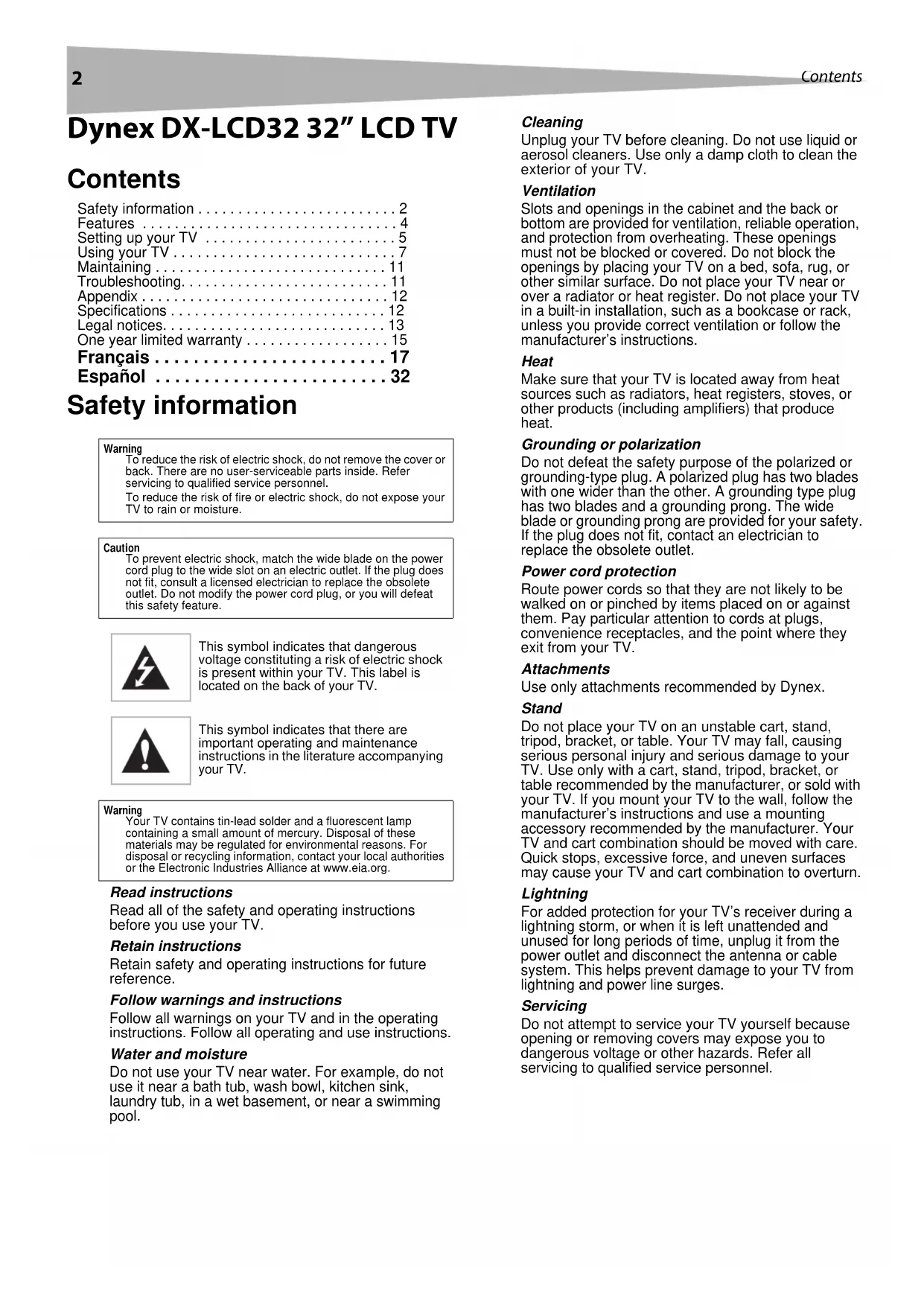 - Español Safety information Read instructions Read all of the safety and operating instructions before you use your TV. Retain instructions Retain safety and operating instructions for future reference. Follow warnings and instructions Follow all warnings on your TV and in the operating instructions. Follow all operating and use instructions. Water and moisture Do not use your TV near water. For example, do not use it near a bath tub, wash bowl, kitchen sink, laundry tub, in a wet basement, or near a swimming pool. Cleaning Unplug your TV before cleaning. Do not use liquid or aerosol cleaners. Use only a damp cloth to clean the exterior of your TV. Ventilation Slots and openings in the cabinet and the back or bottom are provided for ventilation, reliable operation, and protection from overheating. These openings must not be blocked or covered. Do not block the openings by placing your TV on a bed, sofa, rug, or other similar surface. Do not place your TV near or over a radiator or heat register. Do not place your TV in a built-in installation, such as a bookcase or rack, unless you provide correct ventilation or follow the manufacturer’s instructions. Heat Make sure that your TV is located away from heat sources such as radiators, heat registers, stoves, or other products (including amplifiers) that produce heat. Grounding or polarization Do not defeat the safety purpose of the polarized or grounding-type plug. A polarized plug has two blades with one wider than the other. A grounding type plug has two blades and a grounding prong. The wide blade or grounding prong are provided for your safety. If the plug does not fit, contact an electrician to replace the obsolete outlet. Power cord protection Route power cords so that they are not likely to be walked on or pinched by items placed on or against them. Pay particular attention to cords at plugs, convenience receptacles, and the point where they exit from your TV. Attachments Use only attachments recommended by Dynex. Stand Do not place your TV on an unstable cart, stand, tripod, bracket, or table. Your TV may fall, causing serious personal injury and serious damage to your TV. Use only with a cart, stand, tripod, bracket, or table recommended by the manufacturer, or sold with your TV. If you mount your TV to the wall, follow the manufacturer’s instructions and use a mounting accessory recommended by the manufacturer. Your TV and cart combination should be moved with care. Quick stops, excessive force, and uneven surfaces may cause your TV and cart combination to overturn. Lightning For added protection for your TV’s receiver during a lightning storm, or when it is left unattended and unused for long periods of time, unplug it from the power outlet and disconnect the antenna or cable system. This helps prevent damage to your TV from lightning and power line surges. Servicing Do not attempt to service your TV yourself because opening or removing covers may expose you to dangerous voltage or other hazards. Refer all servicing to qualified service personnel.WarningTo reduce the risk of electric shock, do not remove the cover or back. There are no user-serviceable parts inside. Refer servicing to qualified service personnel.To reduce the risk of fire or electric shock, do not expose your TV to rain or moisture.CautionTo prevent electric shock, match the wide blade on the power cord plug to the wide slot on an electric outlet. If the plug does not fit, consult a licensed electrician to replace the obsolete outlet. Do not modify the power cord plug, or you will defeat this safety feature.This symbol indicates that dangerous voltage constituting a risk of electric shock is present within your TV. This label is located on the back of your TV.This symbol indicates that there are important operating and maintenance instructions in the literature accompanying your TV.WarningYour TV contains tin-lead solder and a fluorescent lamp containing a small amount of mercury. Disposal of these materials may be regulated for environmental reasons. For disposal or recycling information, contact your local authorities or the Electronic Industries Alliance at www.eia.org.S p. 32
