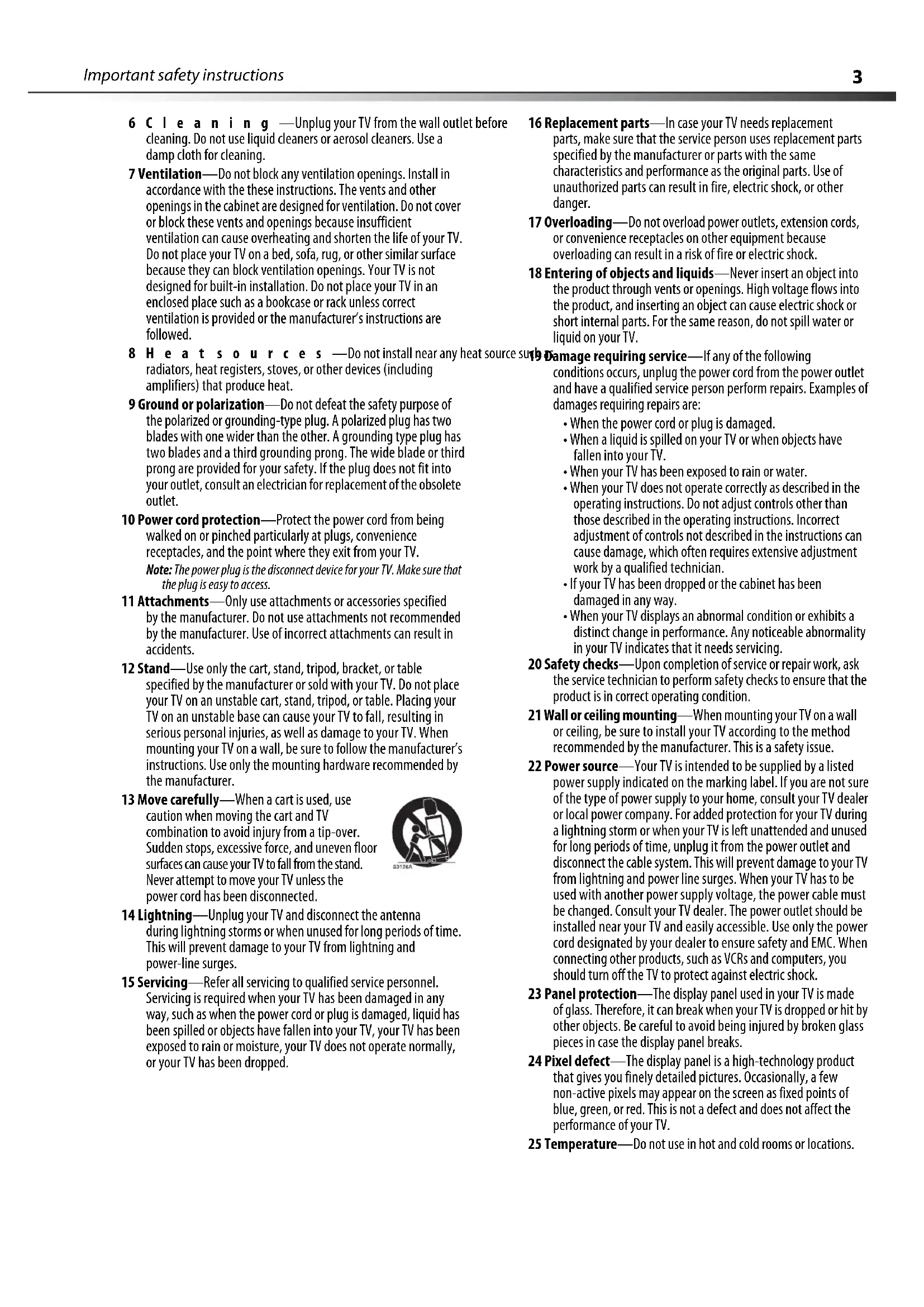 12 Stand—Use only the cart, stand, tripod, bracket, or table specified by the manufacturer or sold with your TV. Do not place your TV on an unstable cart, stand, tripod, or table. Placing your TV on an unstable base can cause your TV to fall, resulting in serious personal injuries, as well as damage to your TV. When mounting your TV on a wall, be sure to follow the manufacturer's instructions. Use only the mounting hardware recommended by the manufacturer.