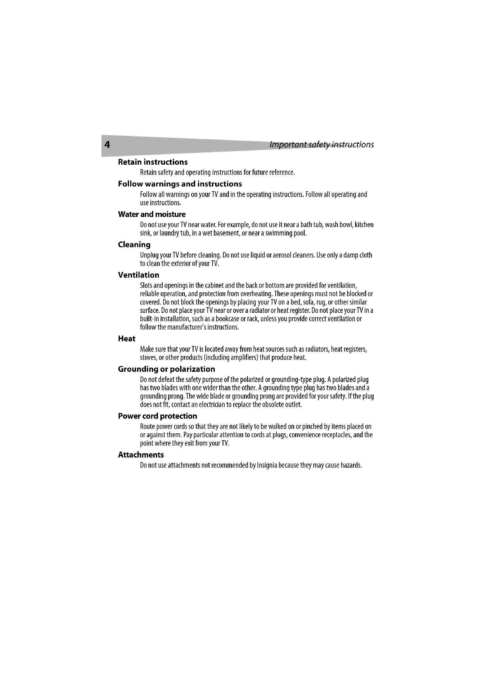 Do not use your TV near water. For example, do not use it near a bath tub, wash bowl, kitchen sink, or laundry tub, in a wet basement, or near a swimming pool.