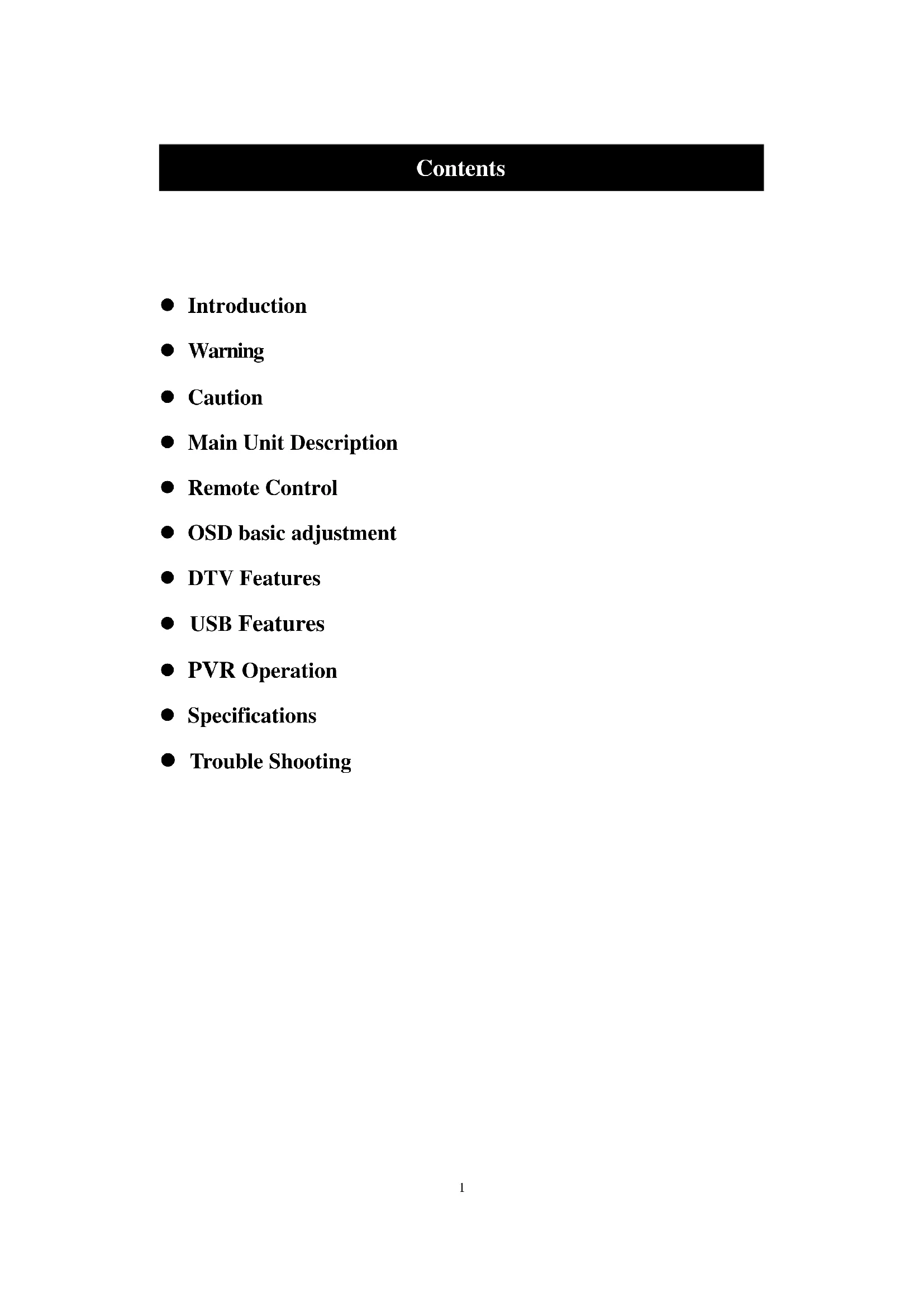 Introduction Warning Caution Main Unit Description Remote Control OSD basic adjustment DTV Features USB Features PVR Operation Specifications Trouble Shooting2 Intr oduction Than k you very much for your purchase of our product of LED TV. It serves as a normal color TV and PC monitor. To enjoy your TV to the full from the very beginning, read this manual carefully and keep it handy for ready reference.