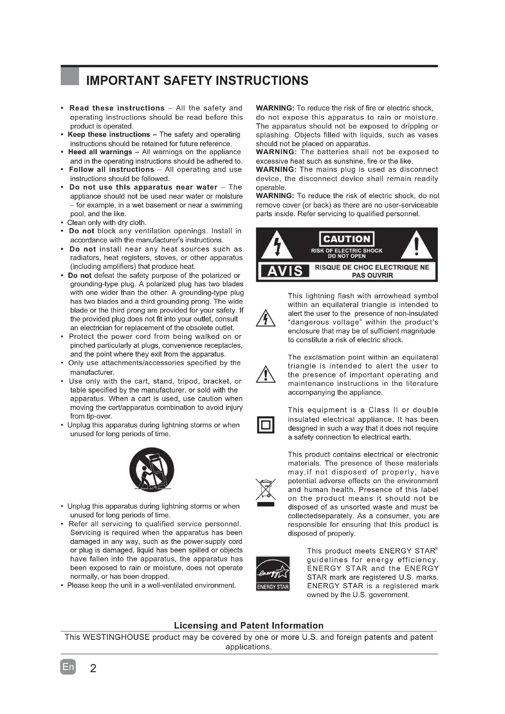 Licensing and Patent Information This WESTINGHOUSE product may be covered by one or more U.S. and foreign patents and patent applications.3