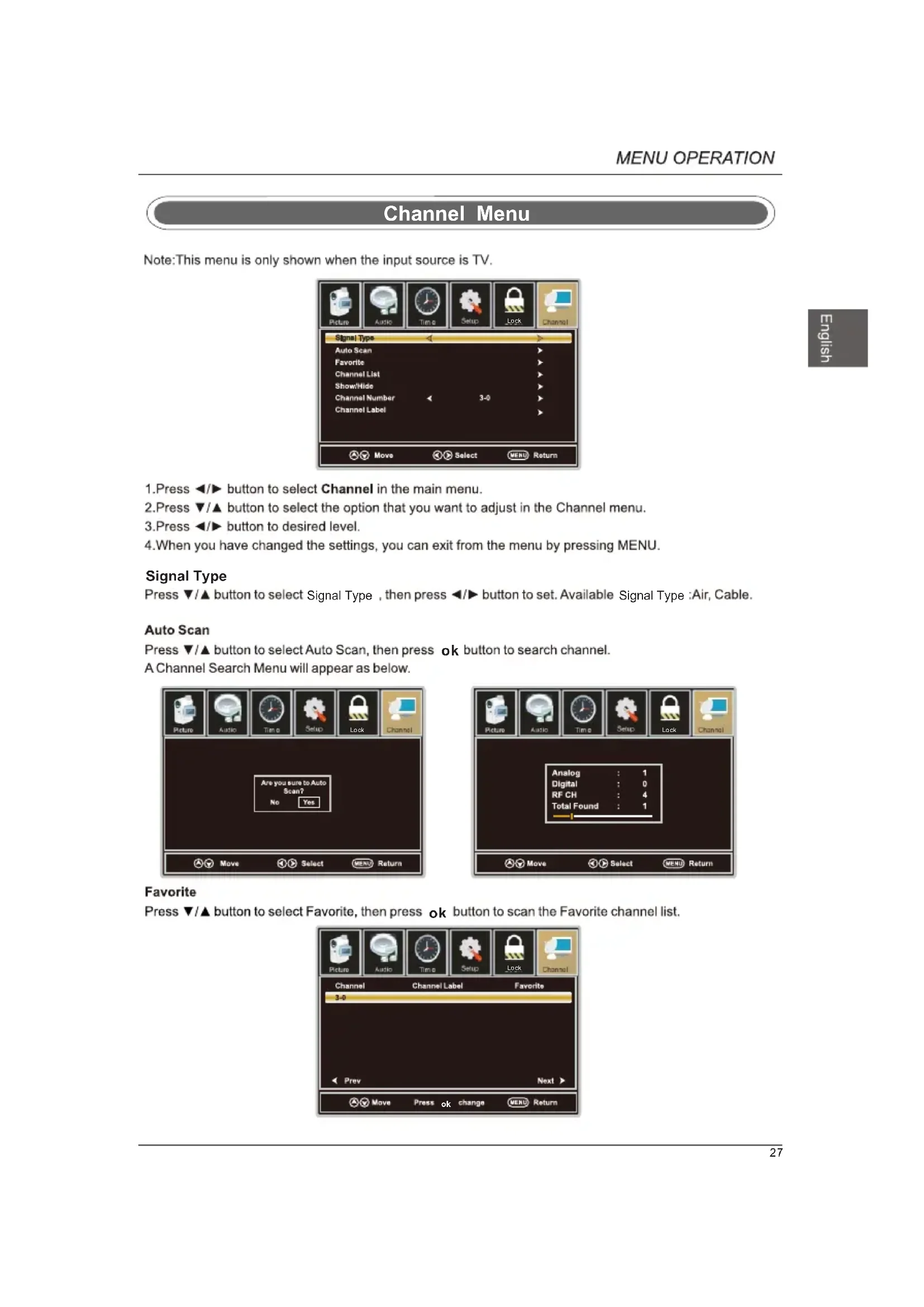 INFO Displays Press to set the closed caption. V-CHIP Switch to V-CHIP input. CH.LIST Press to display TV program list. ASPECT Allows you to navigate the on -screen menus and adjust the system settings to your preference. Displays the main TV menu. Exit the main TV menu. FAV Press to display the favourite program list. Add/Erase channel to favourite program list. ADD/ERASE FAV+ FAV- Press these two keys to switch to your favourite program.