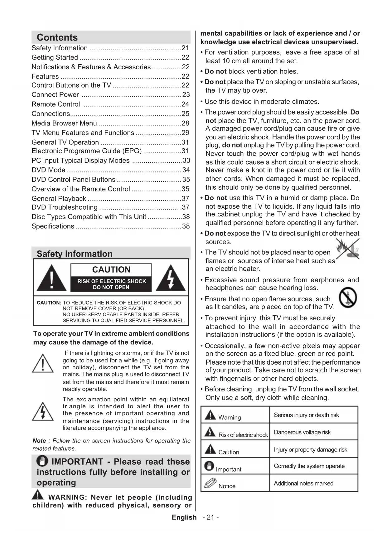 - Before cleaning, unplug the TV from the wall socket. Only use a soft, dry cloth while cleaning. WarningSerious injury or death risk Risk of electric shockDangerous voltage risk CautionInjury or property damage risk ImportantCorrectly the system operate NoticeAdditional notes marked Safety Information ................................................21 Getting Started .....................................................22 Notications&Features&Accessories ................22 Features ...............................................................22 Control Buttons on the TV ....................................22 Connect Power .................................................... 23 Remote Control ...................................................24 Connections..........................................................25 Media Browser Menu............................................28 TV Menu Features and Functions ........................29 General TV Operation ..........................................31 Electronic Programme Guide (EPG) ....................31 PC Input Typical Display Modes .......................... 33 DVD Mode ............................................................ 34 DVD Control Panel Buttons .................................. 35 Overview of the Remote Control ..........................35 General Playback .................................................37 DVD Troubleshooting ...........................................37 Disc Types Compatible with This Unit ..................38 Specications .......................................................38Getting Started English - 22 - Notications&Features&Accessories Environmental Information This television is designed to consume less energy to help save the environment. To reduce energy consumption, you should take the following steps: If you set the Power Save Mode as Eco, the TV will switch to energy-saving mode. The Power Save Mode settings can be found In the ‘Picture’ section of the Main Menu. Note that some picture settings will be unavailable to be changed. If Picture Off is selected, “Screen will be off in 3 seconds.” message will be displayed. Select PROCEED and press OK to continue. The screen will be off immediately. When the TV is not in use, please switch off or disconnect the TV from the mains plug. This will also reduce energy consumption. StandbyNotications