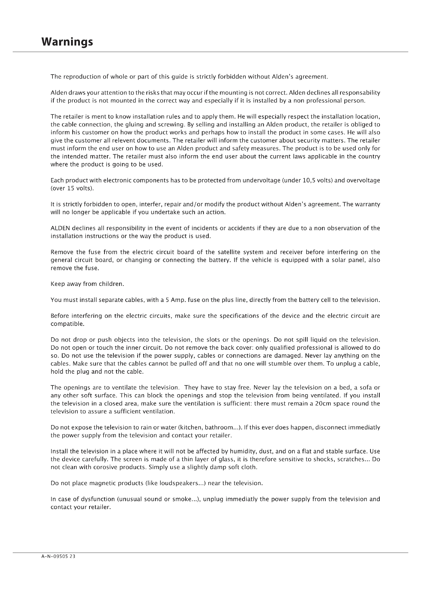 Warning: If the Buyer decides to undergo reparation without Alden Loisirs et Techniques's agreement, he will have to support all the consequences and the warranty will become void. Nor the buyern nor the end user can demand compensation for privation of the product for less than 30 days. Alden Loisirs et Techniques can under no circumstance be held responsible for accidents or damage due to non observation of the installation instructions. We remind you that any electric installation must be protected with an adapted fuse.