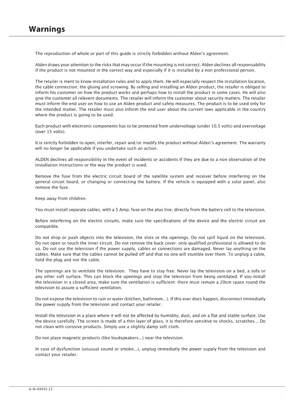 N° de série : ....................................................................................................................................................................................................................A-N-09505 23 Warnings The reproduction of whole or part of this guide is strictly forbidden without Aldenʼs agreement. Alden draws your attention to the risks that may occur if the mounting is not correct. Alden declines all responsability if the product is not mounted in the correct way and especially if it is installed by a non professional person. The retailer is ment to know installation rules and to apply them. He will especially respect the installation location, the cable connection, the gluing and screwing. By selling and installing an Alden product, the retailer is obliged to inform his customer on how the product works and perhaps how to install the product in some cases. He will also give the customer all relevent documents. The retailer will inform the customer about security matters. The retailer must inform the end user on how to use an Alden product and safety measures. The product is to be used only for the intended matter. The retailer must also inform the end user about the current laws applicable in the country where the product is going to be used. Each product with electronic components has to be protected from undervoltage (under 10,5 volts) and overvoltage (over 15 volts). It is strictly forbidden to open, interfer, repair and/or modify the product without Aldenʼs agreement. The warranty will no longer be applicable if you undertake such an action. ALDEN declines all responsibility in the event of incidents or accidents if they are due to a non observation of the installation instructions or the way the product is used. Remove the fuse from the electric circuit board of the satellite system and receiver before interfering on the general circuit board, or changing or connecting the battery. If the vehicle is equipped with a solar panel, also remove the fuse. Keep away from children. You must install separate cables, with a 5 Amp. fuse on the plus line, directly from the battery cell to the television. Before interfering on the electric circuits, make sure the specifications of the device and the electric circuit are compatible. Do not drop or push objects into the television, the slots or the openings. Do not spill liquid on the television. Do not open or touch the inner circuit. Do not remove the back cover: only qualified professional is allowed to do so. Do not use the television if the power supply, cables or connections are damaged. Never lay anything on the cables. Make sure that the cables cannot be pulled off and that no one will stumble over them. To unplug a cable, hold the plug and not the cable. The openings are to ventilate the television. They have to stay free. Never lay the television on a bed, a sofa or any other soft surface. This can block the openings and stop the television from being ventilated. If you install the television in a closed area, make sure the ventilation is sufficient: there must remain a 20cm space round the television to assure a sufficient ventilation. Do not expose the television to rain or water (kitchen, bathroom...). If this ever does happen, disconnect immediatly the power supply from the television and contact your retailer. Install the television in a place where it will not be affected by humidity, dust, and on a flat and stable surface. Use the device carefully. The screen is made of a thin layer of glass, it is therefore sensitive to shocks, scratches... Do not clean with corosive products. Simply use a slightly damp soft cloth. Do not place magnetic products (like loudspeakers...) near the television. In case of dysfunction (unusual sound or smoke...), unplug immediatly the power supply from the television and contact your retailer.A-N-0950524 A high ambient temperature may cause the television to dysfunction. Do not use nor stock the television in direct sunlight or near a source of heat. If the ambient temperature is too low, the quality of the picture may be affected. If this is the case, switch the television off and wait for a few minutes. If the problem remains when you switch the television on again, change the ambient temperature. Unplug the television from the power supply before interfering with the television. Only use the foot sold with the device. The television must be mooved carefully. It may fall in case of brutal stop, in case of acceleration or when driving on damaged roads. Never install the television in a place where it will be in direct contact with sunlight, high temperatures, high humidity or a lot of dust: this could damage the internal parts of the television. Place the television on a stable surface and handle with care. The screen is made of glass and can be damaged if droped, in case of collision or scraped. When the television is not used during a long period, disconnect the power supply. In case of dysfunction (unusual sound or smoke...), unplug immediatly the power supply from the television and contact your retailer. Unplug the television from the power supply before attempting to repair it. Make sure the technicien uses authorized spare parts. If these parts are not conform they may cause fire, electric shock or other dangers. Follow all the maintenance and reparation procedures, make sure the technicien controls all security devices to ensure that the television can be used without danger.