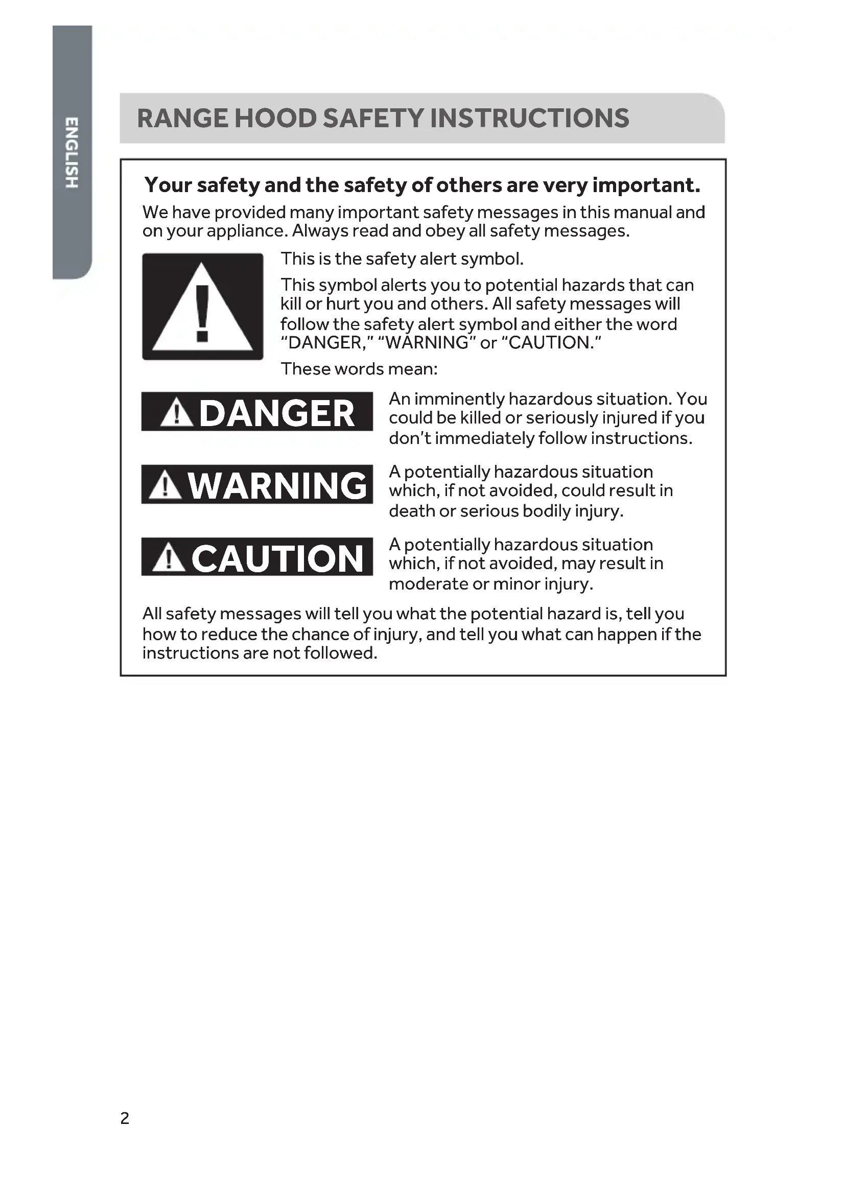 Your safety and the safety of others are very important. We have provided many important safety messages in this manual and on your appliance. Always read and obey all safety messages. DANGER WARNING CAUTION This is the safety alert symbol. This symbol alerts you to potential hazards that can kill or hurt you and others. All safety messages will follow the safety alert symbol and either the word “DANGER,” “WARNING” or “CAUTION.” These words mean: An imminently hazardous situation. You could be killed or seriously injured if you don’t immediately follow instructions. A potentially hazardous situation which, if not avoided, could result in death or serious bodily injury. A potentially hazardous situation which, if not avoided, may result in moderate or minor injury. All safety messages will tell you what the potential hazard is, tell you how to reduce the chance of injury, and tell you what can happen if the instructions are not followed.3 IMPORTANT SAFETY INSTRUCTIONS