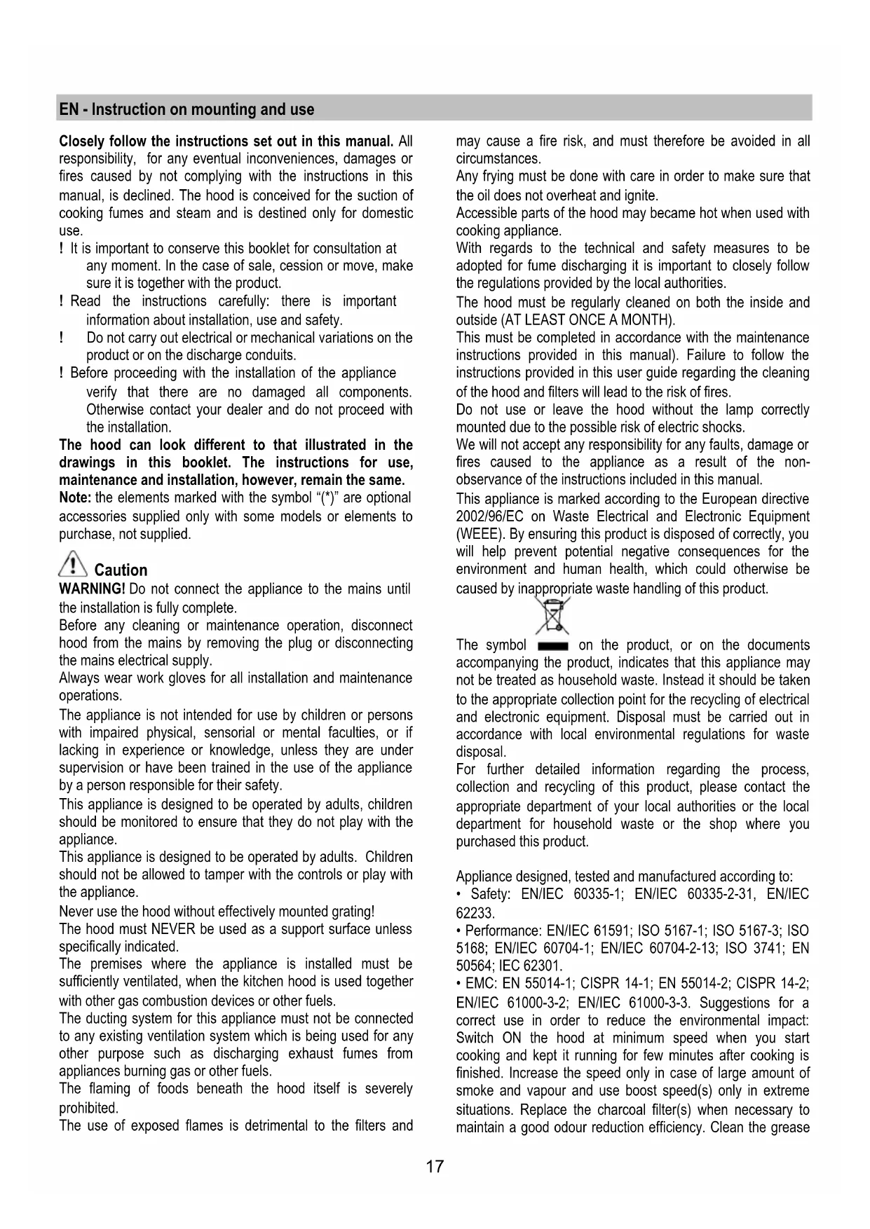 - EMC: EN 55014-1; CISPR 14-1; EN 55014-2; CISPR 14-2; EN/IEC 61000-3-2; EN/IEC 61000-3-3. Suggestions for a correct use in order to reduce the environmental impact: Switch ON the hood at minimum speed when you start cooking and kept it running for few minutes after cooking is finished. Increase the speed only in case of large amount of smoke and vapour and use boost speed(s) only in extreme situations. Replace the charcoal filter(s) when necessary to maintain a good odour reduction efficiency. Clean the grease18 filter(s) when necessary to maintain a good grease filter efficiency. Use the maximum diameter of the ducting system indicated in this manual to optimize efficiency and minimize noise. Use The hood is designed to be used either for exhausting or filter version. Ducting version The hood is equipped with a top air outlet B for discharge of fumes to the outside (exhaust pipe and pipe fixing clamps not provided). Connect the hood and discharge holes on the walls with a diameter equivalent to the air outlet (connection flange). Using the tubes and discharge holes on walls with smaller dimensions will cause a diminution of the suction performance and a drastic increase in noise. Any responsibility in the matter is therefore declined. Attention! If the hood is supplied with carbon filter, then it must be removed. Filter version Should it not be possible to discharge cooking fumes and vapour to the outside, the hood can be used in the filter version, fitting an activated carbon filter and the deflector F on the support (bracket) G, fumes and vapours are recycled through the top grille H by means of an exhaust pipe connected to the top air outlet B and the connection ring mounted on the deflector F (exhaust pipe and pipe fixing clamps not provided). Attention! If the hood is not supplied with carbon filter, then it must be ordered and mounted. Installation The minimum distance between the supporting surface for the cooking equipment on the hob and the lowest part of the range hood must be not less than 50cm from electric cookers and 65cm from gas or mixed cookers. If the instructions for installation for the gas hob specify a greater distance, this must be adhered to. Electrical connection The mains power supply must correspond to the rating indicated on the plate situated inside the hood. If provided with a plug connect the hood to a socket in compliance with current regulations and positioned in an accessible area, after installation. If it not fitted with a plug (direct mains connection) or if the plug is not located in an accessible area, after installation, apply a double pole switch in accordance with standards which assures the complete disconnection of the mains under conditions relating to over-current category III, in accordance with installation instructions. Warning! Before re-connecting the hood circuit to the mains supply and checking the efficient function, always check that the mains cable is correctly assembled. Mounting Before beginning installation: