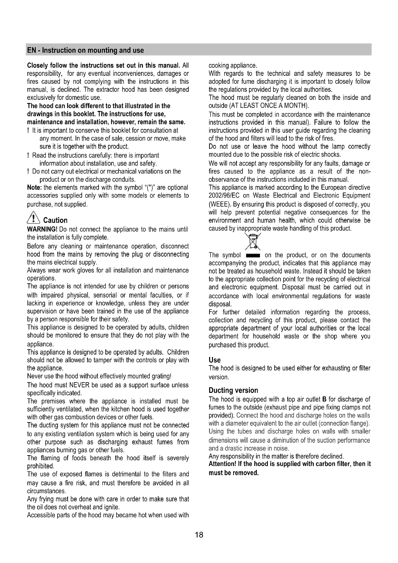 The hood can look different to that illustrated in the drawings in this booklet. The instructions for use, maintenance and installation, however, remain the same.