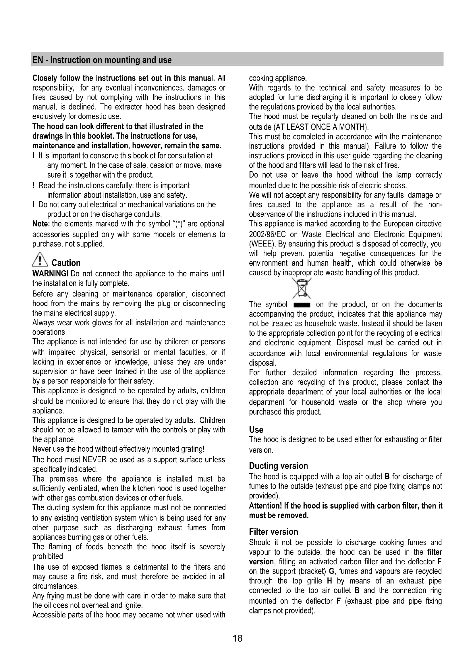 (Schnappverschluss). Sollte die Beleuchtung nicht funktionieren, erst kontrollieren, ob die Lampen einwandfrei eingesetzt sind, bevor man sich an den Kundendienst wendet.18 EN - Instruction on mounting and use Closely follow the instructions set out in this manual. All responsibility, for any eventual inconveniences, damages or fires caused by not complying with the instructions in this manual, is declined. The extractor hood has been designed exclusively for domestic use. The hood can look different to that illustrated in the drawings in this booklet. The instructions for use, maintenance and installation, however, remain the same. ! It is important to conserve this booklet for consultation at any moment. In the case of sale, cession or move, make sure it is together with the product. ! Read the instructions carefully: there is important information about installation, use and safety. ! Do not carry out electrical or mechanical variations on the product or on the discharge conduits. Note: the elements marked with the symbol “(*)” are optional accessories supplied only with some models or elements to purchase, not supplied. Caution WARNING! Do not connect the appliance to the mains until the installation is fully complete. Before any cleaning or maintenance operation, disconnect hood from the mains by removing the plug or disconnecting the mains electrical supply. Always wear work gloves for all installation and maintenance operations. The appliance is not intended for use by children or persons with impaired physical, sensorial or mental faculties, or if lacking in experience or knowledge, unless they are under supervision or have been trained in the use of the appliance by a person responsible for their safety. This appliance is designed to be operated by adults, children should be monitored to ensure that they do not play with the appliance. This appliance is designed to be operated by adults. Children should not be allowed to tamper with the controls or play with the appliance. Never use the hood without effectively mounted grating! The hood must NEVER be used as a support surface unless specifically indicated. The premises where the appliance is installed must be sufficiently ventilated, when the kitchen hood is used together with other gas combustion devices or other fuels. The ducting system for this appliance must not be connected to any existing ventilation system which is being used for any other purpose such as discharging exhaust fumes from appliances burning gas or other fuels. The flaming of foods beneath the hood itself is severely prohibited. The use of exposed flames is detrimental to the filters and may cause a fire risk, and must therefore be avoided in all circumstances. Any frying must be done with care in order to make sure that the oil does not overheat and ignite. Accessible parts of the hood may became hot when used with cooking appliance. With regards to the technical and safety measures to be adopted for fume discharging it is important to closely follow the regulations provided by the local authorities. The hood must be regularly cleaned on both the inside and outside (AT LEAST ONCE A MONTH). This must be completed in accordance with the maintenance instructions provided in this manual). Failure to follow the instructions provided in this user guide regarding the cleaning of the hood and filters will lead to the risk of fires. Do not use or leave the hood without the lamp correctly mounted due to the possible risk of electric shocks. We will not accept any responsibility for any faults, damage or fires caused to the appliance as a result of the non- observance of the instructions included in this manual. This appliance is marked according to the European directive 2002/96/EC on Waste Electrical and Electronic Equipment (WEEE). By ensuring this product is disposed of correctly, you will help prevent potential negative consequences for the environment and human health, which could otherwise be caused by inappropriate waste handling of this product. The symbol on the product, or on the documents accompanying the product, indicates that this appliance may not be treated as household waste. Instead it should be taken to the appropriate collection point for the recycling of electrical and electronic equipment. Disposal must be carried out in accordance with local environmental regulations for waste disposal. For further detailed information regarding the process, collection and recycling of this product, please contact the appropriate department of your local authorities or the local department for household waste or the shop where you purchased this product. Use The hood is designed to be used either for exhausting or filter version. Ducting version The hood is equipped with a top air outlet B for discharge of fumes to the outside (exhaust pipe and pipe fixing clamps not provided). Attention! If the hood is supplied with carbon filter, then it must be removed. Filter version Should it not be possible to discharge cooking fumes and vapour to the outside, the hood can be used in the filter version, fitting an activated carbon filter and the deflector F on the support (bracket) G, fumes and vapours are recycled through the top grille H by means of an exhaust pipe connected to the top air outlet B and the connection ring mounted on the deflector F (exhaust pipe and pipe fixing clamps not provided).19 Attention! If the hood is not supplied with carbon filter, then it must be ordered and mounted. The models with no suction motor only operate in ducting mode, and must be connected to an external suction device (not supplied). The connecting instructions are supplied with the peripheral suction unit. Installation The minimum distance between the supporting surface for the cooking equipment on the hob and the lowest part of the range hood must be not less than 50cm from electric cookers and 65cm from gas or mixed cookers. If the instructions for installation for the gas