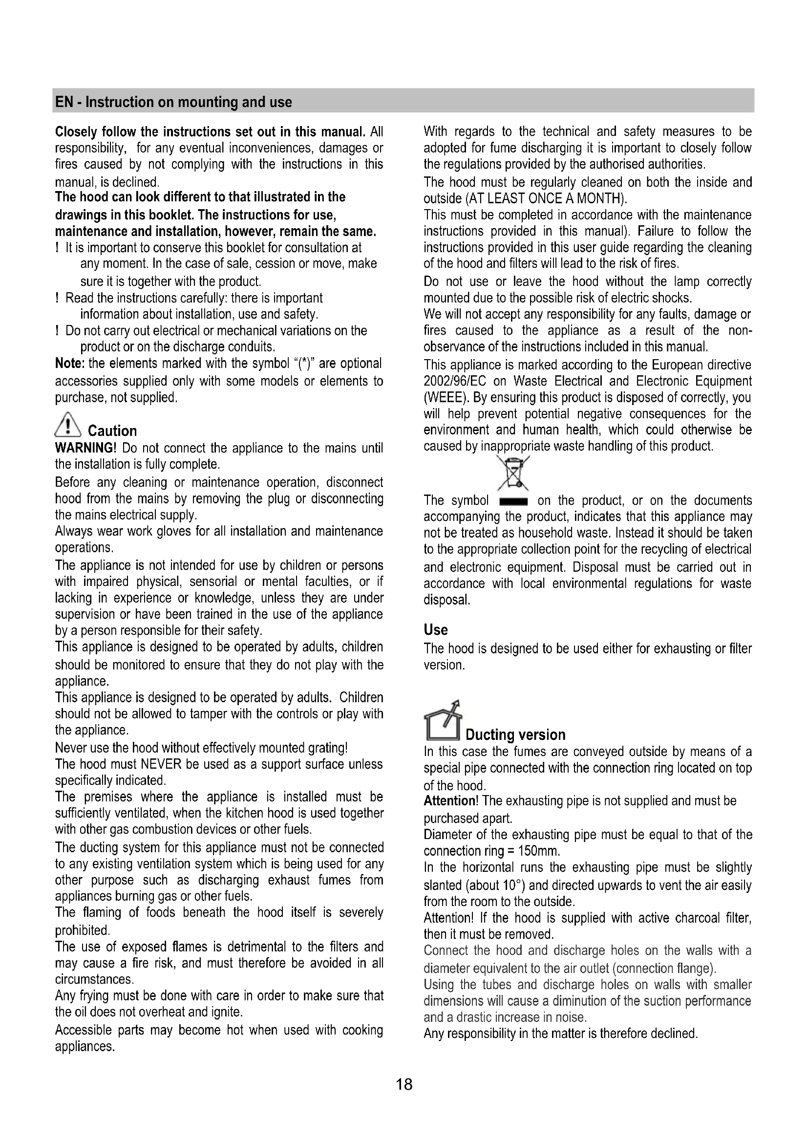 (Schnappverschluss). Sollte die Beleuchtung nicht funktionieren, erst kontrollieren, ob die Lampen einwandfrei eingesetzt sind, bevor man sich an den Kundendienst wendet.18 EN - Instruction on mounting and use Closely follow the instructions set out in this manual. All responsibility, for any eventual inconveniences, damages or fires caused by not complying with the instructions in this manual, is declined. The hood can look different to that illustrated in the drawings in this booklet. The instructions for use, maintenance and installation, however, remain the same. ! It is important to conserve this booklet for consultation at any moment. In the case of sale, cession or move, make sure it is together with the product. ! Read the instructions carefully: there is important information about installation, use and safety. ! Do not carry out electrical or mechanical variations on the product or on the discharge conduits. Note: the elements marked with the symbol “(*)” are optional accessories supplied only with some models or elements to purchase, not supplied. Caution WARNING! Do not connect the appliance to the mains until the installation is fully complete. Before any cleaning or maintenance operation, disconnect hood from the mains by removing the plug or disconnecting the mains electrical supply. Always wear work gloves for all installation and maintenance operations. The appliance is not intended for use by children or persons with impaired physical, sensorial or mental faculties, or if lacking in experience or knowledge, unless they are under supervision or have been trained in the use of the appliance by a person responsible for their safety. This appliance is designed to be operated by adults, children should be monitored to ensure that they do not play with the appliance. This appliance is designed to be operated by adults. Children should not be allowed to tamper with the controls or play with the appliance. Never use the hood without effectively mounted grating! The hood must NEVER be used as a support surface unless specifically indicated. The premises where the appliance is installed must be sufficiently ventilated, when the kitchen hood is used together with other gas combustion devices or other fuels. The ducting system for this appliance must not be connected to any existing ventilation system which is being used for any other purpose such as discharging exhaust fumes from appliances burning gas or other fuels. The flaming of foods beneath the hood itself is severely prohibited. The use of exposed flames is detrimental to the filters and may cause a fire risk, and must therefore be avoided in all circumstances. Any frying must be done with care in order to make sure that the oil does not overheat and ignite. Accessible parts may become hot when used with cooking appliances. With regards to the technical and safety measures to be adopted for fume discharging it is important to closely follow the regulations provided by the authorised authorities. The hood must be regularly cleaned on both the inside and outside (AT LEAST ONCE A MONTH). This must be completed in accordance with the maintenance instructions provided in this manual). Failure to follow the instructions provided in this user guide regarding the cleaning of the hood and filters will lead to the risk of fires. Do not use or leave the hood without the lamp correctly mounted due to the possible risk of electric shocks. We will not accept any responsibility for any faults, damage or fires caused to the appliance as a result of the non- observance of the instructions included in this manual. This appliance is marked according to the European directive 2002/96/EC on Waste Electrical and Electronic Equipment (WEEE). By ensuring this product is disposed of correctly, you will help prevent potential negative consequences for the environment and human health, which could otherwise be caused by inappropriate waste handling of this product. The symbol on the product, or on the documents accompanying the product, indicates that this appliance may not be treated as household waste. Instead it should be taken to the appropriate collection point for the recycling of electrical and electronic equipment. Disposal must be carried out in accordance with local environmental regulations for waste disposal. Use The hood is designed to be used either for exhausting or filter version. Ducting version In this case the fumes are conveyed outside by means of a special pipe connected with the connection ring located on top of the hood. Attention! The exhausting pipe is not supplied and must be purchased apart. Diameter of the exhausting pipe must be equal to that of the connection ring = 150mm. In the horizontal runs the exhausting pipe must be slightly slanted (about 10°) and directed upwards to vent the air easily from the room to the outside. Attention! If the hood is supplied with active charcoal filter, then it must be removed. Connect the hood and discharge holes on the walls with a diameter equivalent to the air outlet (connection flange). Using the tubes and discharge holes on walls with smaller dimensions will cause a diminution of the suction performance and a drastic increase in noise. Any responsibility in the matter is therefore declined.19 ! Use a duct of the minimum indispensible length. ! Use a duct with as few elbows as possible (maximum elbow angle: 90°). ! Avoid drastic changes in the duct cross-section. ! Use a duct with an as smooth as possible inside. ! The duct must be made of certified material. Filter version One active charcoal filter is needed for this and can be obtained from your usual retailer. The filter removes the grease and smells from the extracted air before sending it back into the room through the upper outlet grid. The models with no suction motor only operate in ducting mode, and must be connected to an external suction device (not supplied). The connecting instructions are supplied with the perip