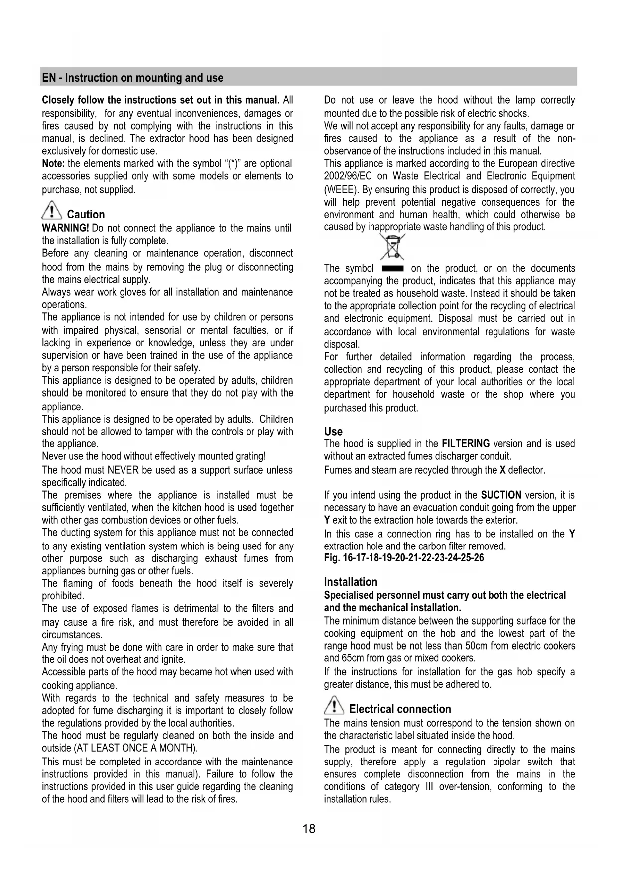 Einige Modelle sehen seitliche Lampen vor: Ersetzen nur mit identischen Lampenform max 40W (E14). Zum Austausch der Lampen muss der Deckel A entfernt werden. Sollte die Beleuchtung nicht funktionieren, erst kontrollieren, ob die Lampen einwandfrei eingesetzt sind, bevor man sich an den Kundendienst wendet.18 EN - Instruction on mounting and use Closely follow the instructions set out in this manual. All responsibility, for any eventual inconveniences, damages or fires caused by not complying with the instructions in this manual, is declined. The extractor hood has been designed exclusively for domestic use. Note: the elements marked with the symbol “(*)” are optional accessories supplied only with some models or elements to purchase, not supplied. Caution WARNING! Do not connect the appliance to the mains until the installation is fully complete. Before any cleaning or maintenance operation, disconnect hood from the mains by removing the plug or disconnecting the mains electrical supply. Always wear work gloves for all installation and maintenance operations. The appliance is not intended for use by children or persons with impaired physical, sensorial or mental faculties, or if lacking in experience or knowledge, unless they are under supervision or have been trained in the use of the appliance by a person responsible for their safety. This appliance is designed to be operated by adults, children should be monitored to ensure that they do not play with the appliance. This appliance is designed to be operated by adults. Children should not be allowed to tamper with the controls or play with the appliance. Never use the hood without effectively mounted grating! The hood must NEVER be used as a support surface unless specifically indicated. The premises where the appliance is installed must be sufficiently ventilated, when the kitchen hood is used together with other gas combustion devices or other fuels. The ducting system for this appliance must not be connected to any existing ventilation system which is being used for any other purpose such as discharging exhaust fumes from appliances burning gas or other fuels. The flaming of foods beneath the hood itself is severely prohibited. The use of exposed flames is detrimental to the filters and may cause a fire risk, and must therefore be avoided in all circumstances. Any frying must be done with care in order to make sure that the oil does not overheat and ignite. Accessible parts of the hood may became hot when used with cooking appliance. With regards to the technical and safety measures to be adopted for fume discharging it is important to closely follow the regulations provided by the local authorities. The hood must be regularly cleaned on both the inside and outside (AT LEAST ONCE A MONTH). This must be completed in accordance with the maintenance instructions provided in this manual). Failure to follow the instructions provided in this user guide regarding the cleaning of the hood and filters will lead to the risk of fires. Do not use or leave the hood without the lamp correctly mounted due to the possible risk of electric shocks. We will not accept any responsibility for any faults, damage or fires caused to the appliance as a result of the non- observance of the instructions included in this manual. This appliance is marked according to the European directive 2002/96/EC on Waste Electrical and Electronic Equipment (WEEE). By ensuring this product is disposed of correctly, you will help prevent potential negative consequences for the environment and human health, which could otherwise be caused by inappropriate waste handling of this product. The symbol on the product, or on the documents accompanying the product, indicates that this appliance may not be treated as household waste. Instead it should be taken to the appropriate collection point for the recycling of electrical and electronic equipment. Disposal must be carried out in accordance with local environmental regulations for waste disposal. For further detailed information regarding the process, collection and recycling of this product, please contact the appropriate department of your local authorities or the local department for household waste or the shop where you purchased this product. Use The hood is supplied in the FILTERING version and is used without an extracted fumes discharger conduit. Fumes and steam are recycled through the X deflector. If you intend using the product in the SUCTION version, it is necessary to have an evacuation conduit going from the upper Y exit to the extraction hole towards the exterior. In this case a connection ring has to be installed on the Y extraction hole and the carbon filter removed. Fig. 16-17-18-19-20-21-22-23-24-25-26 Installation Specialised personnel must carry out both the electrical and the mechanical installation. The minimum distance between the supporting surface for the cooking equipment on the hob and the lowest part of the range hood must be not less than 50cm from electric cookers and 65cm from gas or mixed cookers. If the instructions for installation for the gas hob specify a greater distance, this must be adhered to. Electrical connection The mains tension must correspond to the tension shown on the characteristic label situated inside the hood. The product is meant for connecting directly to the mains supply, therefore apply a regulation bipolar switch that ensures complete disconnection from the mains in the conditions of category III over-tension, conforming to the installation rules.19 Warning! Detail B (fixing bracket to the ceiling - Fig. 1) is equipped with a conductor (yellow-green) that must be connected to the earth of the domestic electrical plant. Fig. 4 ATTENTION! Be particularly careful about positioning the excess cable. Failure to observe this indication could cause grave damage to the apparatus and/or an electric shock to the user or the installer. For further details see Fig. 8-15 Warining! C