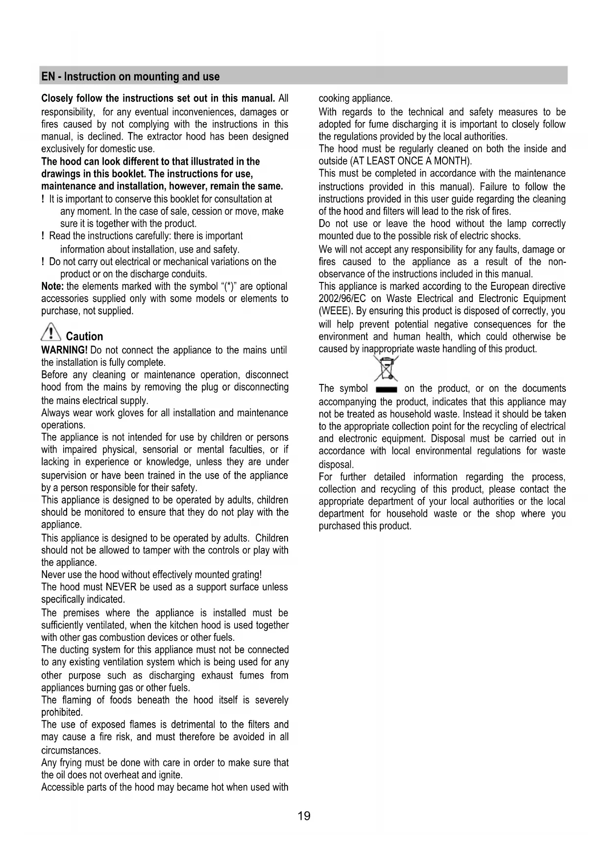 (Schnappverschluss). Sollte die Beleuchtung nicht funktionieren, erst kontrollieren, ob die Lampen einwandfrei eingesetzt sind, bevor man sich an den Kundendienst wendet.19 EN - Instruction on mounting and use Closely follow the instructions set out in this manual. All responsibility, for any eventual inconveniences, damages or fires caused by not complying with the instructions in this manual, is declined. The extractor hood has been designed exclusively for domestic use. The hood can look different to that illustrated in the drawings in this booklet. The instructions for use, maintenance and installation, however, remain the same. ! It is important to conserve this booklet for consultation at any moment. In the case of sale, cession or move, make sure it is together with the product. ! Read the instructions carefully: there is important information about installation, use and safety. ! Do not carry out electrical or mechanical variations on the product or on the discharge conduits. Note: the elements marked with the symbol “(*)” are optional accessories supplied only with some models or elements to purchase, not supplied. Caution WARNING! Do not connect the appliance to the mains until the installation is fully complete. Before any cleaning or maintenance operation, disconnect hood from the mains by removing the plug or disconnecting the mains electrical supply. Always wear work gloves for all installation and maintenance operations. The appliance is not intended for use by children or persons with impaired physical, sensorial or mental faculties, or if lacking in experience or knowledge, unless they are under supervision or have been trained in the use of the appliance by a person responsible for their safety. This appliance is designed to be operated by adults, children should be monitored to ensure that they do not play with the appliance. This appliance is designed to be operated by adults. Children should not be allowed to tamper with the controls or play with the appliance. Never use the hood without effectively mounted grating! The hood must NEVER be used as a support surface unless specifically indicated. The premises where the appliance is installed must be sufficiently ventilated, when the kitchen hood is used together with other gas combustion devices or other fuels. The ducting system for this appliance must not be connected to any existing ventilation system which is being used for any other purpose such as discharging exhaust fumes from appliances burning gas or other fuels. The flaming of foods beneath the hood itself is severely prohibited. The use of exposed flames is detrimental to the filters and may cause a fire risk, and must therefore be avoided in all circumstances. Any frying must be done with care in order to make sure that the oil does not overheat and ignite. Accessible parts of the hood may became hot when used with cooking appliance. With regards to the technical and safety measures to be adopted for fume discharging it is important to closely follow the regulations provided by the local authorities. The hood must be regularly cleaned on both the inside and outside (AT LEAST ONCE A MONTH). This must be completed in accordance with the maintenance instructions provided in this manual). Failure to follow the instructions provided in this user guide regarding the cleaning of the hood and filters will lead to the risk of fires. Do not use or leave the hood without the lamp correctly mounted due to the possible risk of electric shocks. We will not accept any responsibility for any faults, damage or fires caused to the appliance as a result of the non- observance of the instructions included in this manual. This appliance is marked according to the European directive 2002/96/EC on Waste Electrical and Electronic Equipment (WEEE). By ensuring this product is disposed of correctly, you will help prevent potential negative consequences for the environment and human health, which could otherwise be caused by inappropriate waste handling of this product. The symbol on the product, or on the documents accompanying the product, indicates that this appliance may not be treated as household waste. Instead it should be taken to the appropriate collection point for the recycling of electrical and electronic equipment. Disposal must be carried out in accordance with local environmental regulations for waste disposal. For further detailed information regarding the process, collection and recycling of this product, please contact the appropriate department of your local authorities or the local department for household waste or the shop where you purchased this product.20 Use The hood is designed to be used either for exhausting or filter version. Ducting version In this case the fumes are conveyed outside of the building by means of a special pipe connected with the connection ring located on top of the hood. Attention! The exhausting pipe is not supplied and must be purchased apart. Diameter of the exhausting pipe must be equal to that of the connection ring. In the horizontal runs the exhausting pipe must be slightly slanted (about 10°) and directed upwards to vent the air easily from the room to the outside. Attention! If the hood is supplied with active charcoal filter, then it must be removed. Connect the hood and discharge holes on the walls with a diameter equivalent to the air outlet (connection flange). Using the tubes and discharge holes on walls with smaller dimensions will cause a diminution of the suction performance and a drastic increase in noise. Any responsibility in the matter is therefore declined. ! Use a duct of the minimum indispensible length. ! Use a duct with as few elbows as possible (maximum elbow angle: 90°). ! Avoid drastic changes in the duct cross-section. ! Use a duct with an as smooth as possible inside. ! The duct must be made of certified material. Filter version One active charcoal filter is needed for this and can be obtained from yo