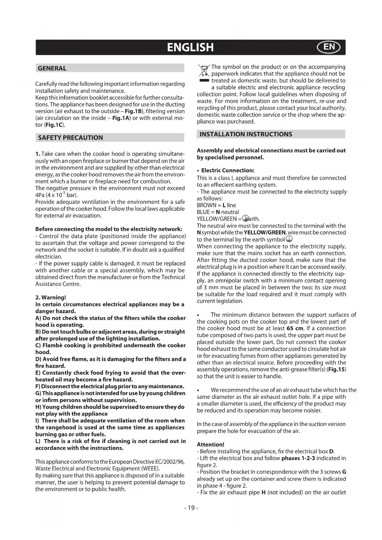 AVVERTENZE. - 18 -GENERAL Carefully read the following important information regarding installation safety and maintenance. Keep this information booklet accessible for further consulta- tions. The appliance has been designed for use in the ducting version (air exhaust to the outside – Fig.1B), ltering version (air circulation on the inside – Fig.1A) or with external mo- tor (Fig.1C). SAFETY PRECAUTION