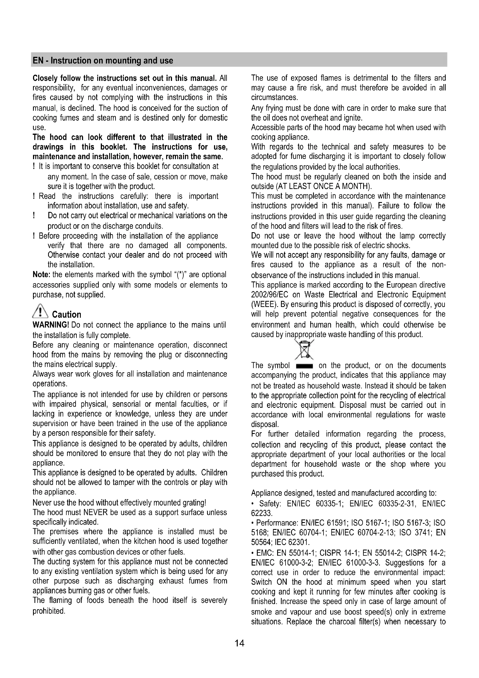 - EMC: EN 55014-1; CISPR 14-1; EN 55014-2; CISPR 14-2; EN/IEC 61000-3-2; EN/IEC 61000-3-3. Suggestions for a correct use in order to reduce the environmental impact: Switch ON the hood at minimum speed when you start cooking and kept it running for few minutes after cooking is finished. Increase the speed only in case of large amount of smoke and vapour and use boost speed(s) only in extreme situations. Replace the charcoal filter(s) when necessary to15 maintain a good odour reduction efficiency. Clean the grease filter(s) when necessary to maintain a good grease filter efficiency. Use the maximum diameter of the ducting system indicated in this manual to optimize efficiency and minimize noise. Additional Installation Specifications: Use only the fixing screws supplied with the product for installation or, if not supplied, purchase the correct screws type. Use the correct length for the screws which are identified in the Installation Guide. In case of doubt, consult an authorised service assistance centre or similar qualified person. WARNING! Failure to install the screws or fixing device in accordance with these instructions may result in electrical hazards. Use The hood is designed to be used either for exhausting or filter version. Ducting version In this case the fumes are conveyed outside of the building by means of a special pipe connected with the connection ring located on top of the hood. Attention! The exhausting pipe is not supplied and must be purchased apart. Diameter of the exhausting pipe must be equal to that of the connection ring. In the horizontal runs the exhausting pipe must be slightly slanted (about 10°) and directed upwards to vent the air easily from the room to the outside. Attention! If the hood is supplied with active charcoal filter, then it must be removed. Connect the hood and discharge holes on the walls with a diameter equivalent to the air outlet (connection flange). Using the tubes and discharge holes on walls with smaller dimensions will cause a diminution of the suction performance and a drastic increase in noise. Any responsibility in the matter is therefore declined. ! Use a duct of the minimum indispensible length. ! Use a duct with as few elbows as possible (maximum elbow angle: 90°). ! Avoid drastic changes in the duct cross-section. ! Use a duct as smooth as possible inside. ! The duct must be made of certified material. Filter version One active charcoal filter is needed for this and can be obtained from your usual retailer. The filter removes the grease and smells from the extracted air before sending it back into the room through the upper outlet grid.