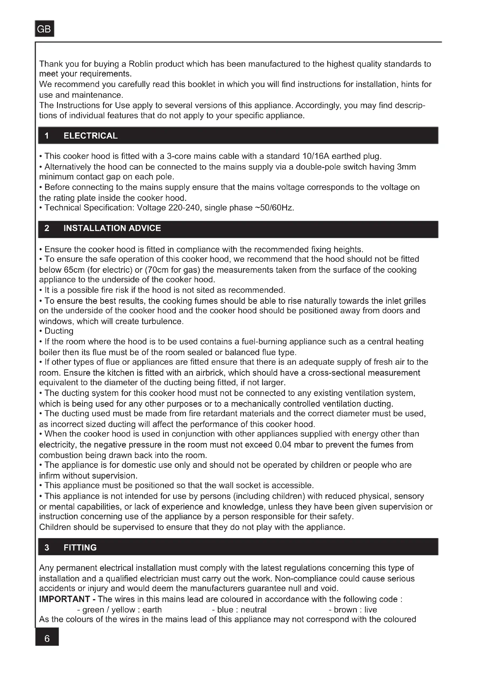 Thank you for buying a Roblin product which has been manufactured to the highest quality standards to meet your requirements. We recommend you carefully read this booklet in which you will nd instructions for installation, hints for use and maintenance. The Instructions for Use apply to several versions of this appliance. Accordingly, you may nd descrip- tions of individual features that do not apply to your specic appliance. 1 ELECTRICAL