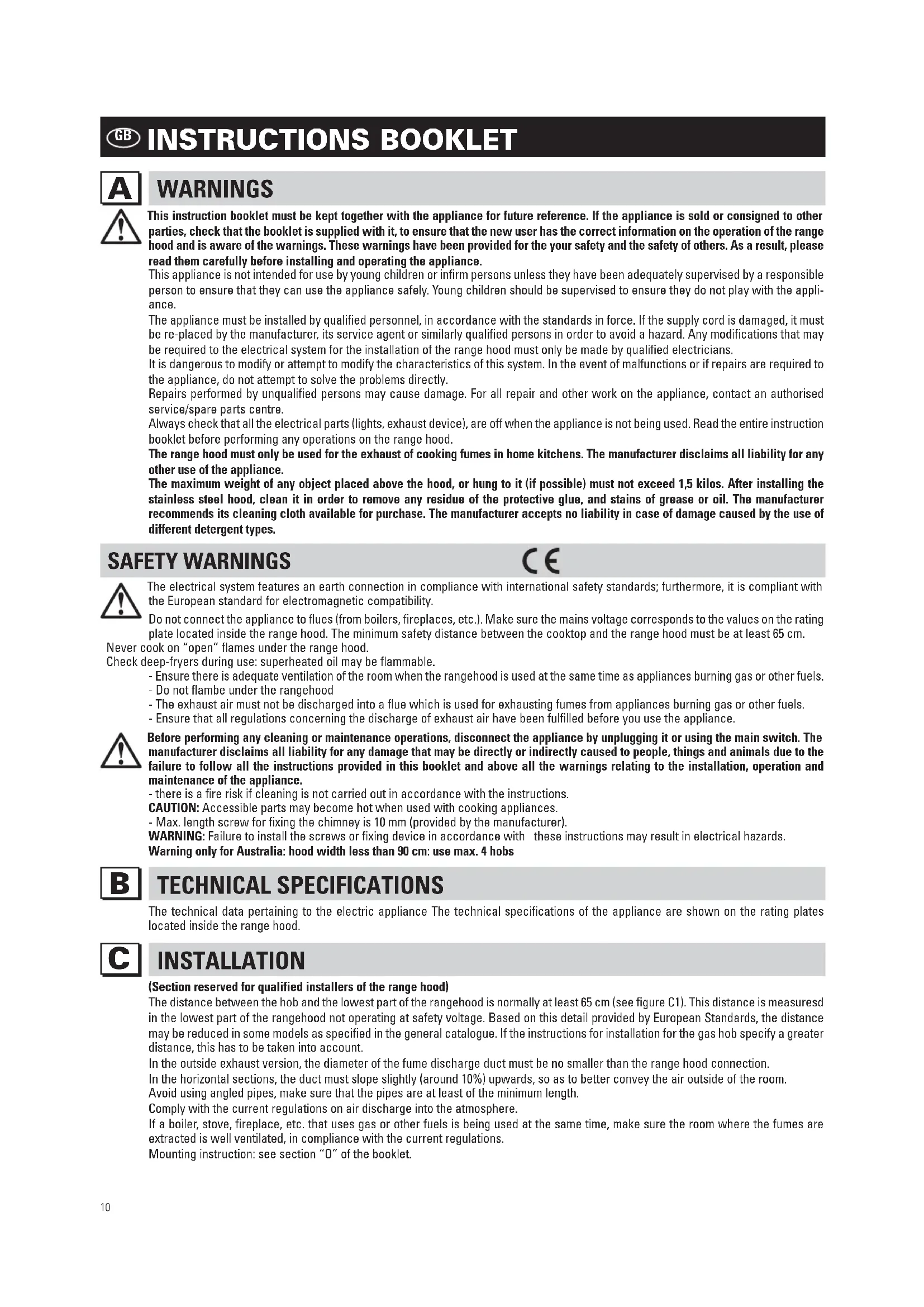 This instruction booklet must be kept together with the appliance for future reference. If the appliance is sold or consigned to other parties, check that the booklet is supplied with it, to ensure that the new user has the correct information on the operation of the range hood and is aware of the warnings. These warnings have been provided for the your safety and the safety of others. As a result, please read them carefully before installing and operating the appliance. This appliance is not intended for use by young children or infirm persons unless they have been adequately supervised by a responsible person to ensure that they can use the appliance safely. Young children should be supervised to ensure they do not play with the appli- ance. The appliance must be installed by qualified personnel, in accordance with the standards in force. If the supply cord is damaged, it must be re-placed by the manufacturer, its service agent or similarly qualified persons in order to avoid a hazard. Any modifications that may be required to the electrical system for the installation of the range hood must only be made by qualified electricians. It is dangerous to modify or attempt to modify the characteristics of this system. In the event of malfunctions or if repairs are required to the appliance, do not attempt to solve the problems directly. Repairs performed by unqualified persons may cause damage. For all repair and other work on the appliance, contact an authorised service/spare parts centre. Always check that all the electrical parts (lights, exhaust device), are off when the appliance is not being used. Read the entire instruction booklet before performing any operations on the range hood. The range hood must only be used for the exhaust of cooking fumes in home kitchens. The manufacturer disclaims all liability for any other use of the appliance. The maximum weight of any object placed above the hood, or hung to it (if possible) must not exceed 1,5 kilos. After installing the stainless steel hood, clean it in order to remove any residue of the protective glue, and stains of grease or oil. The manufacturer recommends its cleaning cloth available for purchase. The manufacturer accepts no liability in case of damage caused by the use of different detergent types. SAFETY WARNINGS The electrical system features an earth connection in compliance with international safety standards; furthermore, it is compliant with the European standard for electromagnetic compatibility. Do not connect the appliance to flues (from boilers, fireplaces, etc.). Make sure the mains voltage corresponds to the values on the rating plate located inside the range hood. The minimum safety distance between the cooktop and the range hood must be at least 65 cm. Never cook on “open” flames under the range hood. Check deep-fryers during use: superheated oil may be flammable. - Ensure there is adequate ventilation of the room when the rangehood is used at the same time as appliances burning gas or other fuels. - Do not flambe under the rangehood - The exhaust air must not be discharged into a flue which is used for exhausting fumes from appliances burning gas or other fuels. - Ensure that all regulations concerning the discharge of exhaust air have been fulfilled before you use the appliance. Before performing any cleaning or maintenance operations, disconnect the appliance by unplugging it or using the main switch. The manufacturer disclaims all liability for any damage that may be directly or indirectly caused to people, things and animals due to the failure to follow all the instructions provided in this booklet and above all the warnings relating to the installation, operation and maintenance of the appliance.- there is a fire risk if cleaning is not carried out in accordance with the instructions.CAUTION: Accessible parts may become hot when used with cooking appliances.- Max. length screw for fixing the chimney is 10 mm (provided by the manufacturer). WARNING: Failure to install the screws or fixing device in accordance with these instructions may result in electrical hazards. Warning only for Australia: hood width less than 90 cm: use max. 4 hobs TECHNICAL SPECIFICATIONS