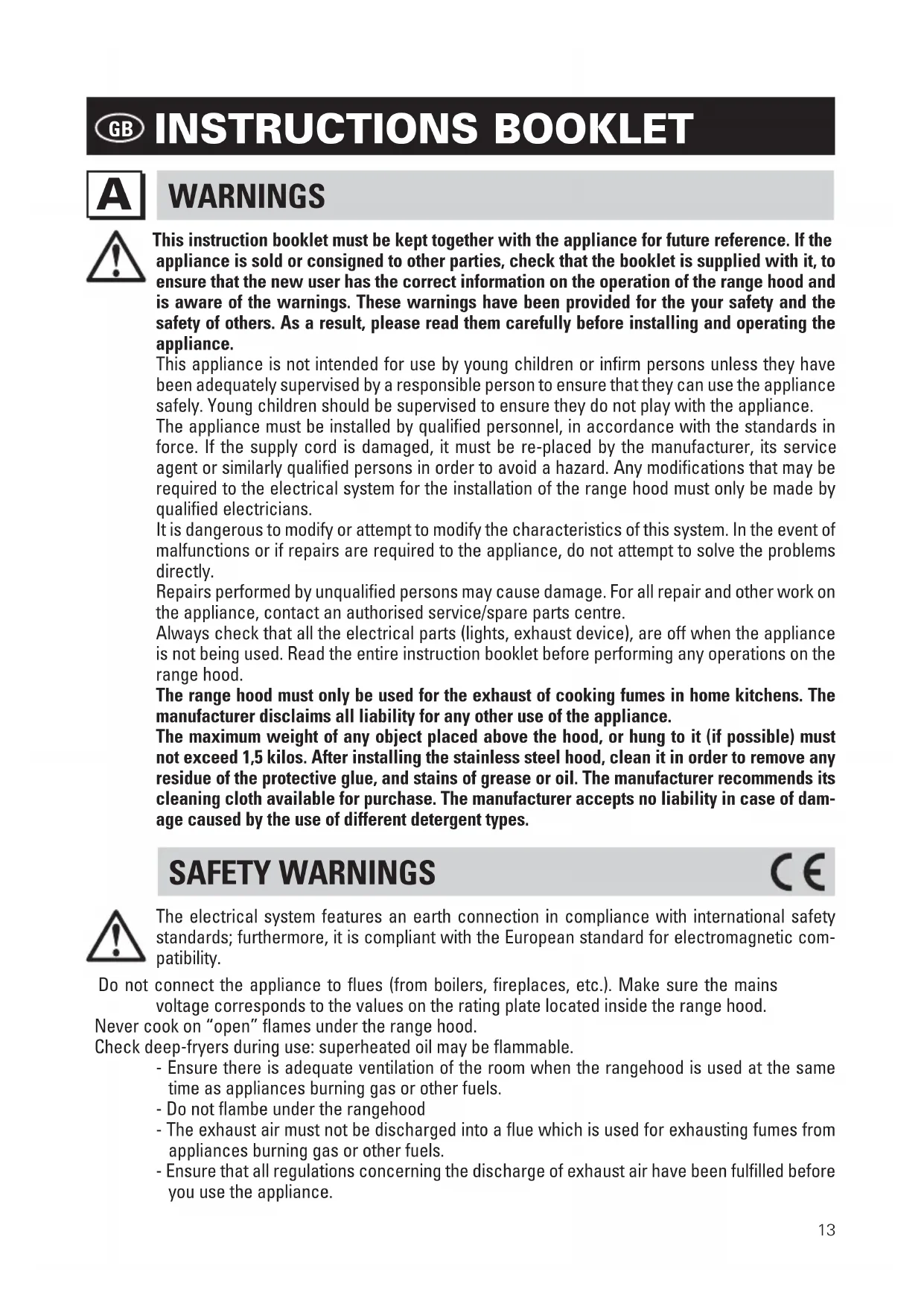 This instruction booklet must be kept together with the appliance for future reference. If the appliance is sold or consigned to other parties, check that the booklet is supplied with it, to ensure that the new user has the correct information on the operation of the range hood and is aware of the warnings. These warnings have been provided for the your safety and the safety of others. As a result, please read them carefully before installing and operating the appliance. This appliance is not intended for use by young children or infirm persons unless they have been adequately supervised by a responsible person to ensure that they can use the appliance safely. Young children should be supervised to ensure they do not play with the appliance. The appliance must be installed by qualified personnel, in accordance with the standards in force. If the supply cord is damaged, it must be re-placed by the manufacturer, its service agent or similarly qualified persons in order to avoid a hazard. Any modifications that may be required to the electrical system for the installation of the range hood must only be made by qualified electricians. It is dangerous to modify or attempt to modify the characteristics of this system. In the event of malfunctions or if repairs are required to the appliance, do not attempt to solve the problems directly. Repairs performed by unqualified persons may cause damage. For all repair and other work on the appliance, contact an authorised service/spare parts centre. Always check that all the electrical parts (lights, exhaust device), are off when the appliance is not being used. Read the entire instruction booklet before performing any operations on the range hood. The range hood must only be used for the exhaust of cooking fumes in home kitchens. The manufacturer disclaims all liability for any other use of the appliance. The maximum weight of any object placed above the hood, or hung to it (if possible) must not exceed 1,5 kilos. After installing the stainless steel hood, clean it in order to remove any residue of the protective glue, and stains of grease or oil. The manufacturer recommends its cleaning cloth available for purchase. The manufacturer accepts no liability in case of dam- age caused by the use of different detergent types. SAFETY WARNINGS The electrical system features an earth connection in compliance with international safety standards; furthermore, it is compliant with the European standard for electromagnetic com- patibility. Do not connect the appliance to flues (from boilers, fireplaces, etc.). Make sure the mains voltage corresponds to the values on the rating plate located inside the range hood. Never cook on “open” flames under the range hood. Check deep-fryers during use: superheated oil may be flammable. - Ensure there is adequate ventilation of the room when the rangehood is used at the same time as appliances burning gas or other fuels. - Do not flambe under the rangehood - The exhaust air must not be discharged into a flue which is used for exhausting fumes from appliances burning gas or other fuels. - Ensure that all regulations concerning the discharge of exhaust air have been fulfilled before you use the appliance.14 Before performing any cleaning or maintenance operations, disconnect the appliance by un- plugging it or using the main switch. The manufacturer disclaims all liability for any damage that may be directly or indirectly caused to people, things and animals due to the failure to follow all the instructions provided in this booklet and above all the warnings relating to the installation, operation and maintenance of the appliance. - there is a fire risk if cleaning is not carried out in accordance with the instructions. CAUTION: Accessible parts may become hot when used with cooking appliances. - Max. length screw for fixing the chimney is 10 mm (provided by the manufacturer).