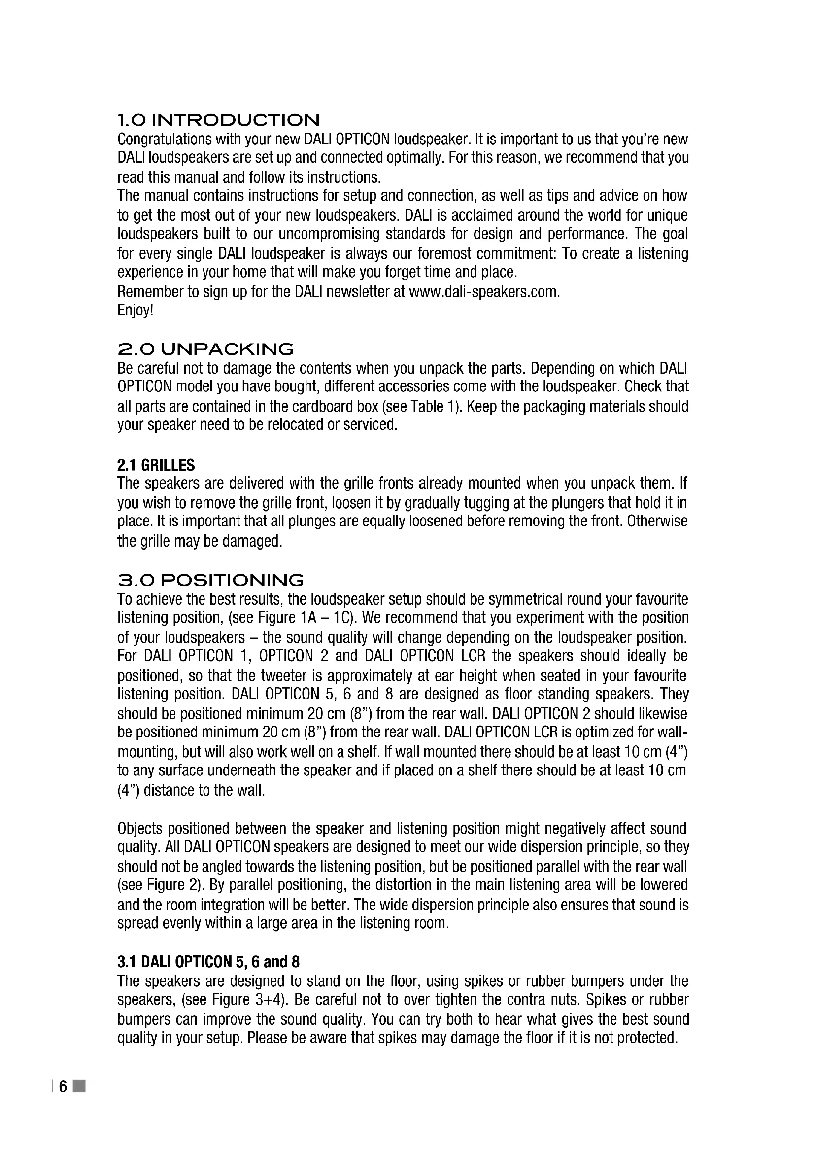 Congratulations with your new DALI OPTICON loudspeaker. It is important to us that you’re new DALI loudspeakers are set up and connected optimally. For this reason, we recommend that you read this manual and follow its instructions. The manual contains instructions for setup and connection, as well as tips and advice on how to get the most out of your new loudspeakers. DALI is acclaimed around the world for unique loudspeakers built to our uncompromising standards for design and performance. The goal for every single DALI loudspeaker is always our foremost commitment: To create a listening experience in your home that will make you forget time and place. Remember to sign up for the DALI newsletter at www.dali-speakers.com. Enjoy!