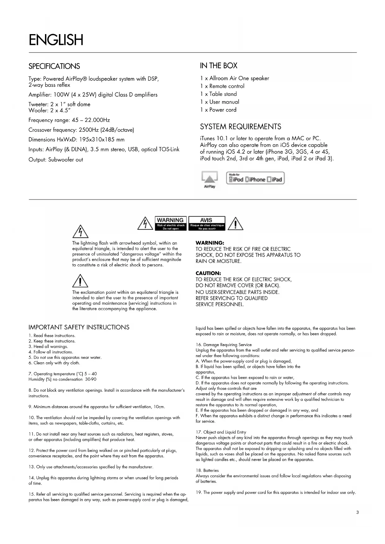 1 x Allroom Air One speaker 1 x Remote control 1 x Table stand 1 x User manual 1 x Power cord ENGLISH SPECIFICATIONS Type: Powered AirPlay® loudspeaker system with DSP, 2-way bass reflex Amplifier: 100W (4 x 25W) digital Class D amplifiers Tweeter: 2 x 1” soft dome Woofer: 2 x 4.5” Frequency range: 45 – 22.000Hz Crossover frequency: 2500Hz (24dB/octave) Dimensions HxWxD: 195x310x185 mm Inputs: AirPlay (& DLNA), 3.5 mm stereo, USB, optical TOS-Link Output: Subwoofer out SYSTEM REQUIREMENTS iTunes 10.1 or later to operate from a MAC or PC. AirPlay can also operate from an iOS device capable of running iOS 4.2 or later (iPhone 3G, 3GS, 4 or 4S, iPod touch 2nd, 3rd or 4th gen, iPad, iPad 2 or iPad 3).4