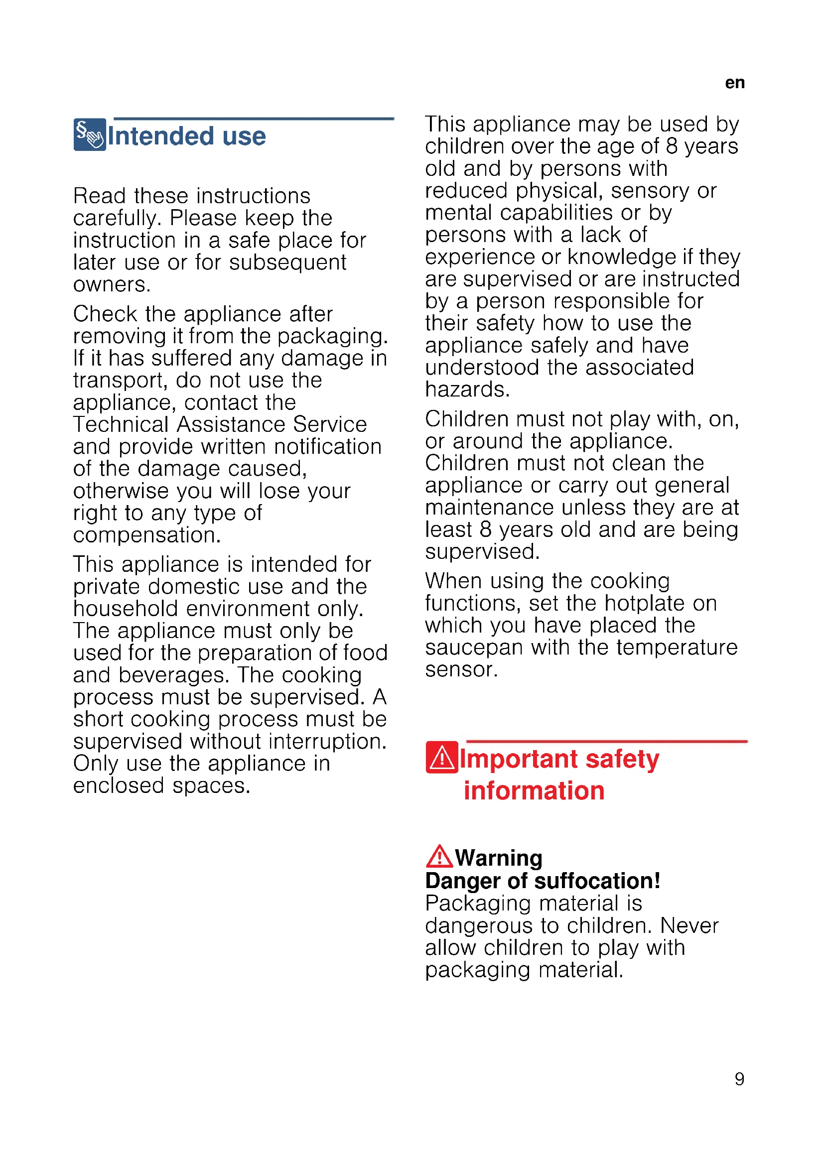 8 Intended use I nt ended use Read these instructions carefully. Please keep the instruction in a safe place for later use or for subsequent owners. Check the appliance after removing it from the packaging. If it has suffered any damage in transport, do not use the appliance, contact the Technical Assistance Service and provide written notification of the damage caused, otherwise you will lose your right to any type of compensation. This appliance is intended for private domestic use and the household environment only. The appliance must only be used for the preparation of food and beverages. The cooking process must be supervised. A short cooking process must be supervised without interruption. Only use the appliance in enclosed spaces. This appliance may be used by children over the age of 8 years old and by persons with reduced physical, sensory or mental capabilities or by persons with a lack of experience or knowledge if they are supervised or are instructed by a person responsible for their safety how to use the appliance safely and have understood the associated hazards. Children must not play with, on, or around the appliance. Children must not clean the appliance or carry out general maintenance unless they are at least 8 years old and are being supervised. When using the cooking functions, set the hotplate on which you have placed the saucepan with the temperature sensor. ( Important safety information Impor t ant saf et y informat i on :Warning Danger of suffocation! Packaging material is dangerous to children. Never allow children to play with packaging material.en
