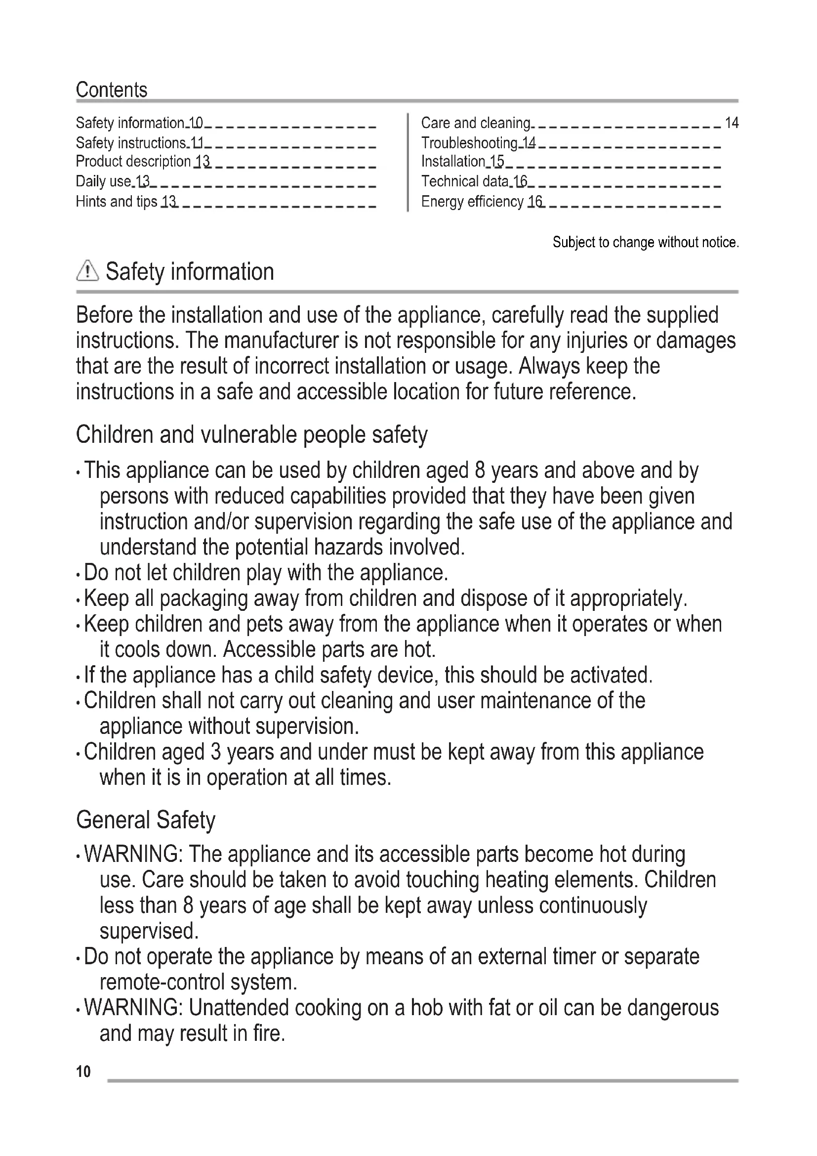 Troubleshooting 14 Installation 15 Technical data 16 Energy efficiency 16 Subject to change without notice. Safety information Before the installation and use of the appliance, carefully read the supplied instructions. The manufacturer is not responsible for any injuries or damages that are the result of incorrect installation or usage. Always keep the instructions in a safe and accessible location for future reference. Children and vulnerable people safety