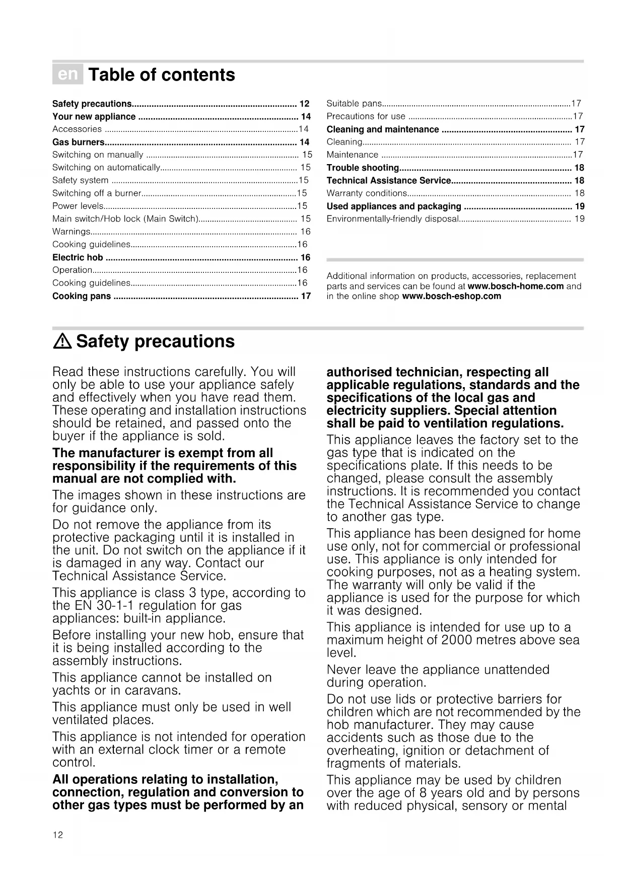 Cooking: Setting Melting: chocolate, butter, gelatine. 1-2 Cooking: rice, white sauce and ragout. 2-3 Cooking: potatoes, pasta, vegetables. 4-5 Light frying: stews, roast joints. 4-5 Steaming: fish. 5 Heating, keeping things warm: ready meals. 2-3-4-5 Grilling: escalopes, steaks, omelettes. 6-7-8 Cooking and browning 917 Cooking pans Suitable pans Precautions for use The following advice is intended to help you save energy and prevent pan damage: Cleaning and maintenance Cleaning Once the appliance is cool, use a sponge to clean it with soap and water. After each use, clean the surface of the respective burner parts once they have cooled down. If any residue is left (baked-on food, drops of grease etc.), however little, it will become stuck to the surface and more difficult to remove later. The holes and grooves must be clean for the flame to ignite properly. The movement of some pans may leave metal residue on the pan supports. Clean the burners and pan supports using soapy water and scrub with a non-wire brush. Alternatively, the pan supports can be put in the dishwasher. Use the dishwasher manufacturer's recommended detergent. If the pan supports are very dirty, they should be cleaned previously. Do not put the burner caps in the dishwasher. If the pan supports are fitted with rubber rests, ensure that these are also cleaned. The rests may come loose and the pan support may scratch the hob. Always dry the burners and pan supports completely. Water droplets or damp patches on the hob at the start of cooking may damage the enamel. After cleaning and drying the burners, make sure the burner caps are correctly positioned on the diffuser. Caution! ■ Do not use steam cleaners. This could damage the hob. ■ Never use abrasive products, steel scourers, sharp implements, knives, etc. to remove bits of hardened food from the hob. ■ Do not use knives, scrapers or similar implements to clean the point where the glass meets the burner trims, the metal frames or the glass/aluminium panels, if fitted. Maintenance Always clean off any liquid as soon as it is spilt. This will prevent food remains from sticking to the hob surface and you will save yourself any unnecessary effort. Never slide pans across the glass surface, as you may scratch it. In addition, try not to drop heavy or sharp objects on the glass. Never strike any part of the hob. Grains of sand that may come from cleaning fruits and vegetables will scratch the glass surface. Melted sugar, or foods which contain a lot of sugar which may have spilt, should be cleaned off the hotplate immediately, using the glass scraper. Avoid spilling salt on the surface of the electric hob. Burner Minimum pan diameter Maximum pan diameter Wok burner 22 cm - cm Rapid burner 22 cm 26 cm Semi-rapid burner 14 cm 20 cm Auxiliary burner 12 cm 16 cm Electric hob 14 cm 18 cm Use pans which are the right size for each burner. Do not use small pans on large burners. The flame must not touch the sides of the pan. Do not use damaged pans, which do not sit evenly on the hob. Pans may tip over. Only use pans with a thick, flat base. Do not cook without using a lid and make sure the lid is properly fitted. This wastes energy. Always centre the pan over the burner, not to one side. Otherwise it could tip over. Do not place large pans on the burners near the control knobs. These may be damaged by the very high temperatures. Place the pans on the pan supports, never directly on the burner. Make sure that the pan supports and burner caps are correctly positioned before using the appliance. Pans should be placed on the hob carefully. Do not strike the hob and do not place excessive weight on it.18 Trouble shooting Sometimes certain faults detected can be easily resolved. Before calling the Technical Assistance Service, bear in mind the following advice: Technical Assistance Service When contacting our Technical Assistance Service, please provide the product number (E-Nr.) and production number (FD) of the appliance. This information is given on the specifications plate located on the lower section of the hob and on the label in the user manual. Please find the contact data of all countries in the enclosed customer service list. To book an engineer visit and product advice Rely on the professionalism of the manufacturer. You can therefore be sure that the repair is carried out by trained service technicians who carry original spare parts for your appliances. Warranty conditions In the unlikely event that the appliance is damaged or does not meet your expectations in terms of quality, please inform us as soon as possible. For the warranty to be valid, the appliance must not have been tampered with, or used inappropriately. The applicable warranty conditions are those set out by the company's representative office in the country of purchase. Detailed information is available from retail outlets. Proof of purchase must be presented to obtain the benefits of the warranty. We reserve the right to introduce changes. Fault Possible cause Solution The general electrical sys- tem is malfunctioning. Defective fuse. Check the fuse in the main fuse box and change it if it is damaged. The automatic safety switch or circuit breaker has tripped. Check the main control panel to see if the auto- matic safety switch or circuit breaker has tripped. The automatic switching on function does not work. There may be food or cleaning products stuck between the ignition sparkers and the burners. The space between the ignition sparker and the burner must be clean. The burners are wet. Dry the burner caps carefully. The burner caps are not correctly positioned. Check that the burner caps are correctly posi- tioned. The appliance is not earthed, is poorly connected or the earthing is faulty. Contact the installation technician. The burner flame is not uni- form. The burner components are not correctly posi- tioned. Correctly place the parts on the appropriate burner. The grooves on the burner are dir