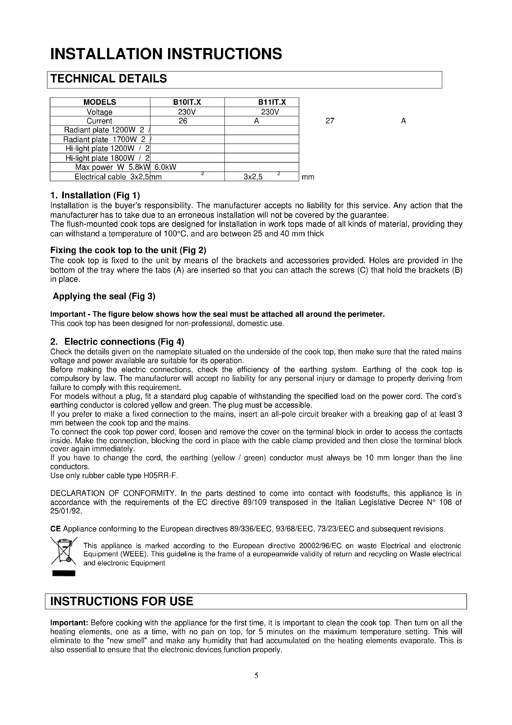 Check the details given on the nameplate situated on the underside of the cook top, then make sure that the rated mains voltage and power available are suitable for its operation. Before making the electric connections, check the efficiency of the earthing system. Earthing of the cook top is compulsory by law. The manufacturer will accept no liability for any personal injury or damage to property deriving from failure to comply with this requirement. For models without a plug, fit a standard plug capable of withstanding the specified load on the power cord. The cord’s earthing conductor is colored yellow and green. The plug must be accessible. If you prefer to make a fixed connection to the mains, insert an all-pole circuit breaker with a breaking gap of at least 3 mm between the cook top and the mains. To connect the cook top power cord, loosen and remove the cover on the terminal block in order to access the contacts inside. Make the connection, blocking the cord in place with the cable clamp provided and then close the terminal block cover again immediately. If you have to change the cord, the earthing (yellow / green) conductor must always be 10 mm longer than the line conductors. Use only rubber cable type H05RR-F. DECLARATION OF CONFORMITY. In the parts destined to come into contact with foodstuffs, this appliance is in accordance with the requirements of the EC directive 89/109 transposed in the Italian Legislative Decree N° 108 of 25/01/92. CE Appliance conforming to the European directives 89/336/EEC, 93/68/EEC, 73/23/EEC and subsequent revisions. This appliance is marked according to the European directive 20002/96/EC on waste Electrical and electronic Equipment (WEEE). This guideline is the frame of a europeanwide validity of return and recycling on Waste electrical and electronic Equipment