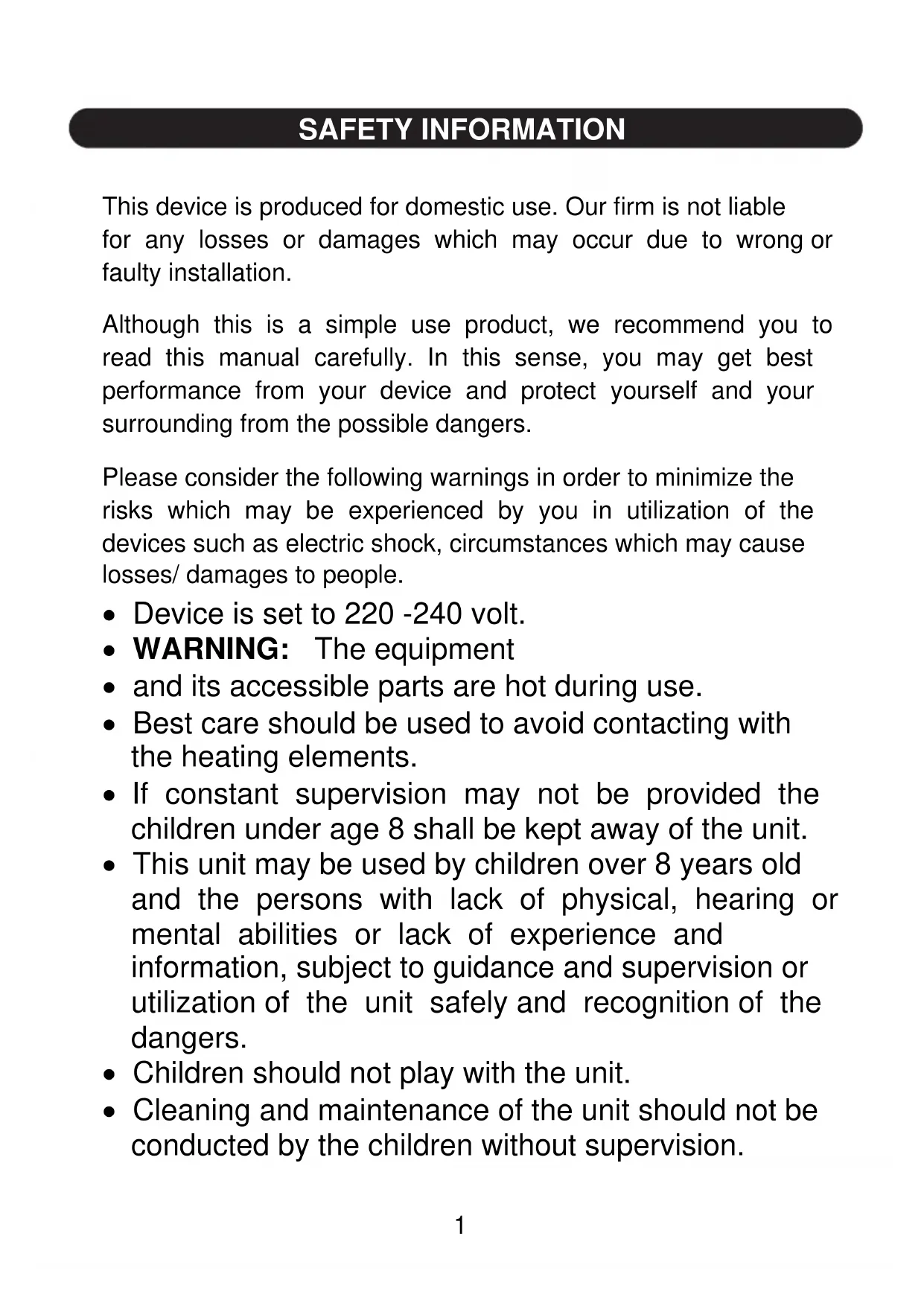 and its accessible parts are hot during use. Best care should be used to avoid contacting with the heating elements. If constant supervision may not be provided the children under age 8 shall be kept away of the unit. This unit may be used by children over 8 years old and the persons with lack of physical, hearing or mental abilities or lack of experience and information, subject to guidance and supervision or utilization of the unit safely and recognition of the dangers. Children should not play with the unit. Cleaning and maintenance of the unit should not be conducted by the children without supervision.2