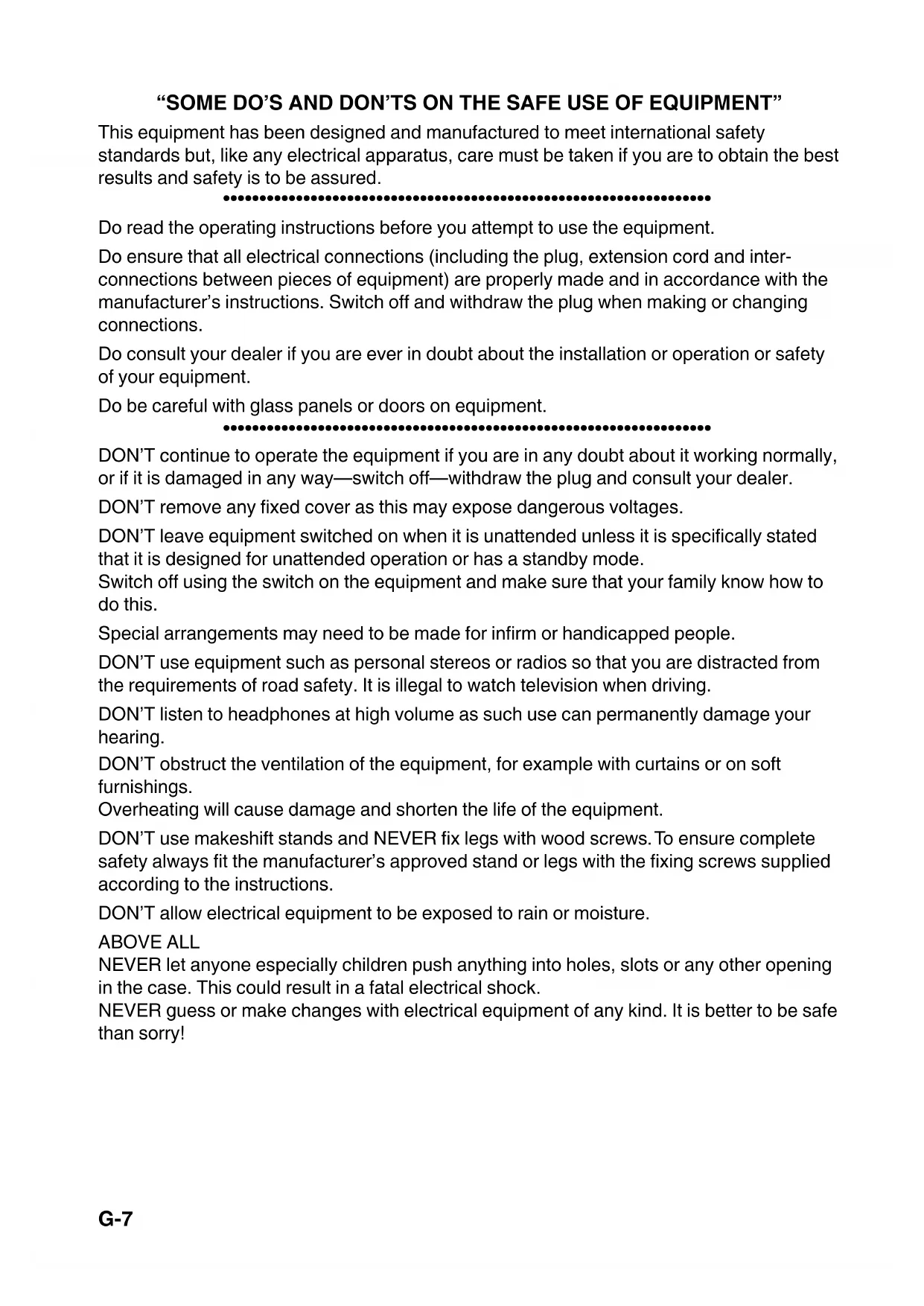 - •••••••••••••••••••••••••••••••••••••••••••••••••••••••••••••••••• Do read the operating instructions before you attempt to use the equipment. Do ensure that all electrical connections (including the plug, extension cord and inter- connections between pieces of equipment) are properly made and in accordance with the manufacturer’s instructions. Switch off and withdraw the plug when making or changing connections. Do consult your dealer if you are ever in doubt about the installation or operation or safety of your equipment. Do be careful with glass panels or doors on equipment.