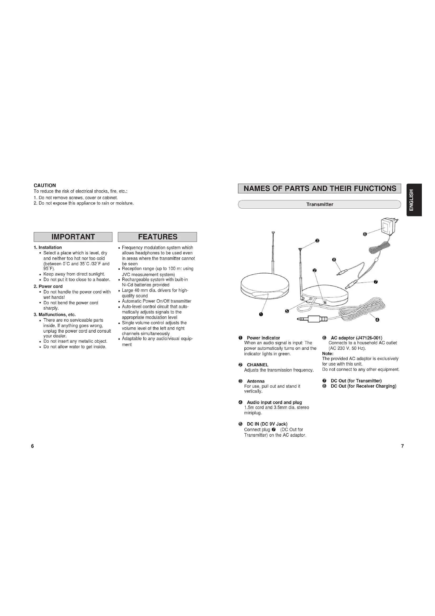 motorcycle, car, etc. HA-W500RF (EG)E.G 10/25/2002 12:54 Page 141716 ENGLISH TROUBLESHOOTING SPECIFICATIONS What appears to be a malfunction may not always be serious. First make sure... Symptoms Cause Remedy Check the connection of the transmitter.Turn the power on the connected AV equipment ON and start playing.Connect them with an optional plug adaptor. (Converts monaural audio output to stereo audio output.)Turn the TUNING controls on the headphones or select the CHANNEL on the transmitter to adjust them.Use them within the range the frequency modulation signal can reach. (Refer to page 10.)Replace it with a new Ni-Cd battery. Please consult your dealer for replacement.Is the transmitter’s power OFF?Is the headphones’ power OFF?Is the battery in the headphones exhausted?Is the volume of the headphones set to the minimum level?Is the volume of the connected AV equipment set to the minimum level?Is the transmitter connected to equipment with monaural audio output?Is the battery in the headphones exhausted?Is the volume of the connected AV equipment set too high?Is the battery in the headphones exhausted?Are the frequency modulation signals being received correctly?Is the volume of the connected AV equipment set too low?Are the headphones too far away from the transmitter?Has the rechargeable Ni-Cd battery expired?No sound.Turn on the headphones’ power. (The indicator lights.)Fully charge the headphones.Adjust the volume of the head-phones to the appropriate level.Raise the volume level of the connected AV equipment as high as possible without causing distortion.Adjust the volume level of the connected AV equipment as high as possible without causing distortion.Adjust the volume level of the connected AV equipment as high as possible without causing distortion.Fully charge the headphones.Fully charge the headphones.No sound fromthe R-channel.Distorted sound.Noisy sound.Battery chargingis impossible. General Specifications Modulation system : Stereo frequency modulation system Carrier frequency : 863 – 865 MHz Usable area (distance to reach) : Max. 100 m (using JVC measurement systems, under controlled ambient conditions) Frequency response : 30 – 15,000 Hz Distortion : Less than 4% (at 1 kHz) Transmitter (J22121-001) Power requirements : DC 9 V (with the exclusive AC adaptor) Audio input terminal : 3.5 mm dia. stereo miniplug Input impedance : 25kΩ Reference input level : 300 mV Dimensions : 100 (W) x 100 (D) x 106 (H) mm (including antenna) Mass : 115 g (without connection cord and AC adaptor) Headphones (HA-W500RF) Power requirements : Rechargeable Ni-Cd battery (1.2 V) x 2 Battery running time : 20 hours (when charged for 24 hours) Mass : 280 g (with installed rechargeable Ni-Cd battery x 2) Provided Accessories Instructions x 1 AC adaptor x 1 Connection cord x 1 (3.5 mm dia. stereo minijack — RCA pin plug x 2: 0.1 m) Plug adaptor x 1 (converts 3.5 mm dia. stereo miniplug to a 6.3 mm dia. standard stereo phone plug)