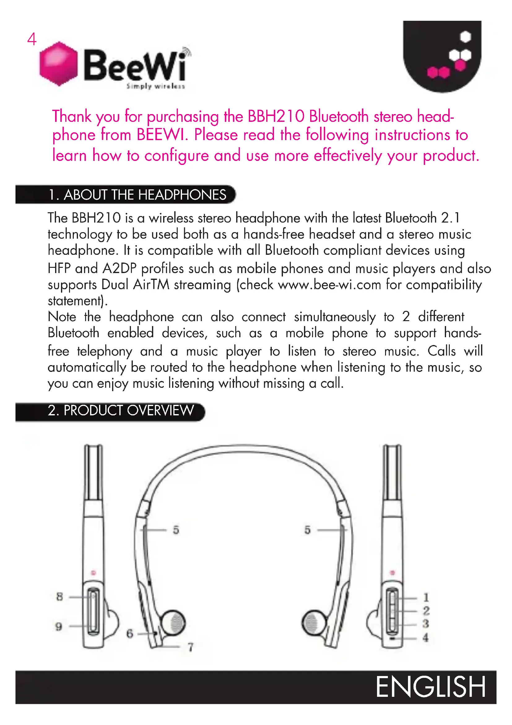 Thank you for purchasing the BBH210 Bluetooth stereo head- phone from BEEWI. Please read the following instructions to learn how to configure and use more effectively your product. ENGLISH