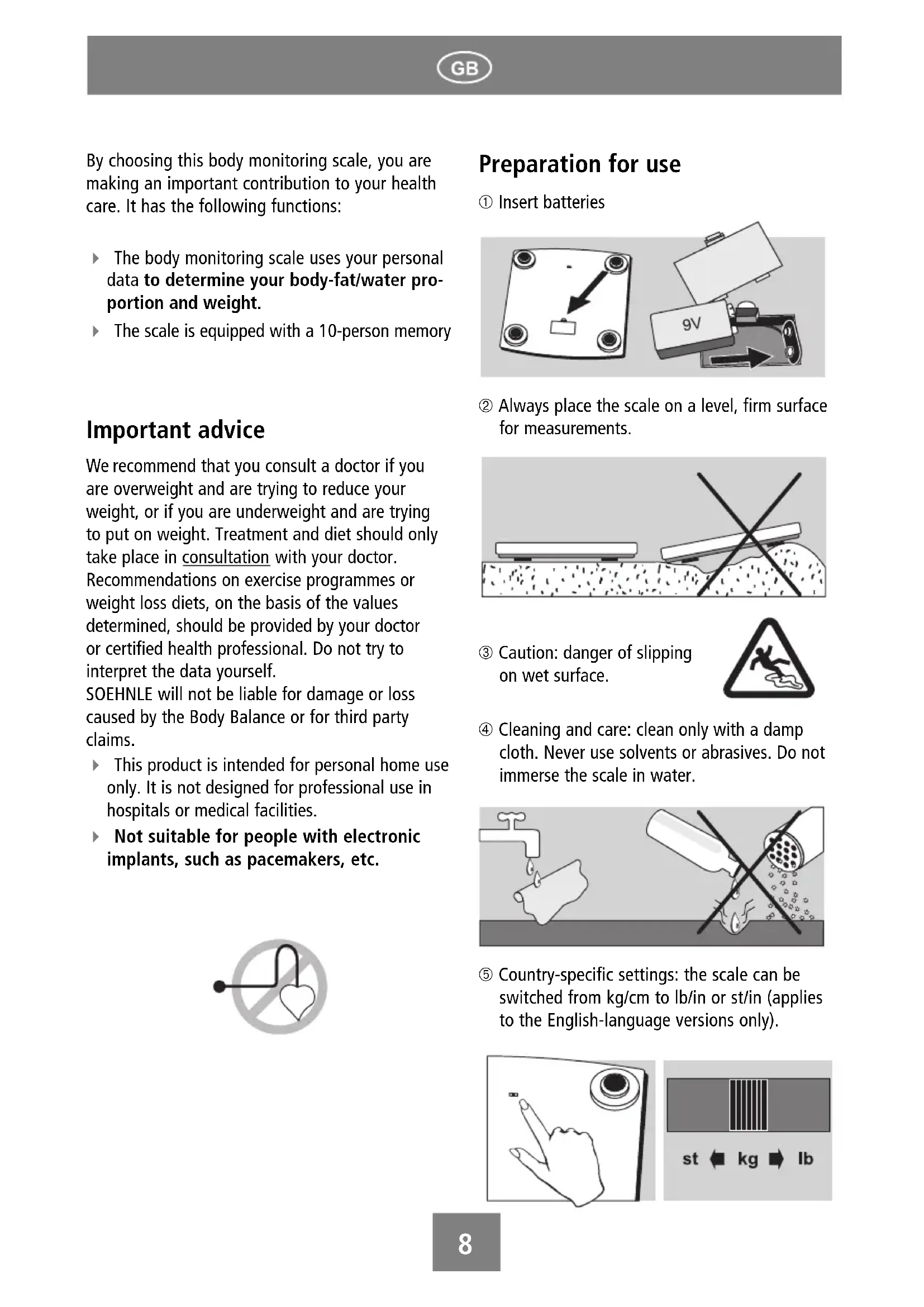 We recommend that you consult a doctor if you are overweight and are trying to reduce your weight, or if you are underweight and are trying to put on weight. Treatment and diet should only take place in consultation with your doctor. Recommendations on exercise programmes or weight loss diets, on the basis of the values determined, should be provided by your doctor or certified health professional. Do not try to interpret the data yourself. SOEHNLE will not be liable for damage or loss caused by the Body Balance or for third party claims.