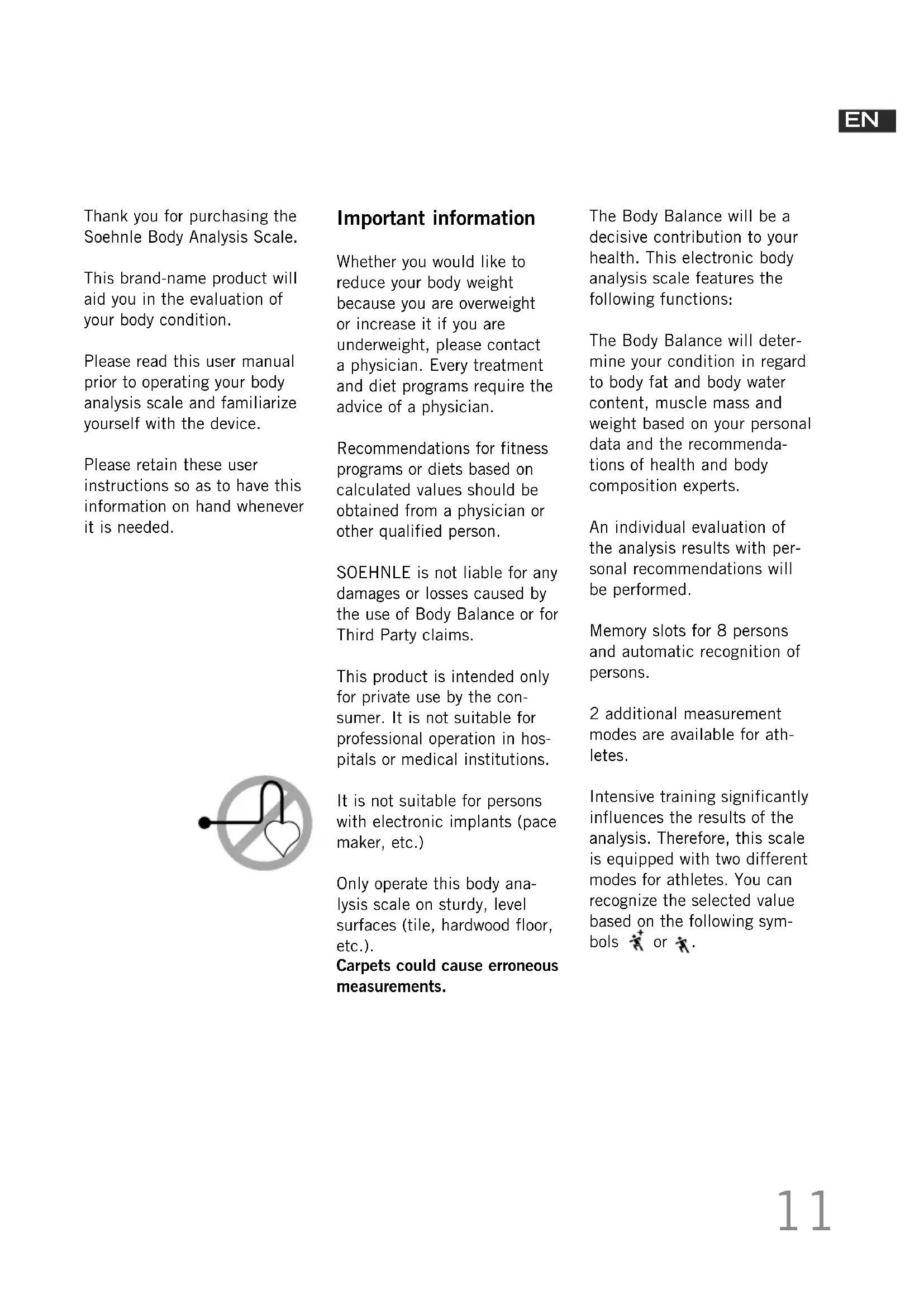 063161_BB-Shape-F4-2630-B_data.indd 10 30.10.2014 14:49:35Thank you for purchasing the Soehnle Body Analysis Scale. This brand-name product will aid you in the evaluation of your body condition. Please read this user manual prior to operating your body analysis scale and familiarize yourself with the device. Please retain these user instructions so as to have this information on hand whenever it is needed. Important information Whether you would like to reduce your body weight because you are overweight or increase it if you are underweight, please contact a physician. Every treatment and diet programs require the advice of a physician. Recommendations for fitness programs or diets based on calculated values should be obtained from a physician or other qualified person. SOEHNLE is not liable for any damages or losses caused by the use of Body Balance or for Third Party claims. This product is intended only for private use by the con- sumer. It is not suitable for professional operation in hos- pitals or medical institutions. It is not suitable for persons with electronic implants (pace maker, etc.) Only operate this body ana- lysis scale on sturdy, level surfaces (tile, hardwood floor, etc.). Carpets could cause erroneous measurements. The Body Balance will be a decisive contribution to your health. This electronic body analysis scale features the following functions: The Body Balance will deter- mine your condition in regard to body fat and body water content, muscle mass and weight based on your personal data and the recommenda- tions of health and body composition experts. An individual evaluation of the analysis results with per- sonal recommendations will be performed. Memory slots for 8 persons and automatic recognition of persons. 2 additional measurement modes are available for ath- letes. Intensive training significantly influences the results of the analysis. Therefore, this scale is equipped with two different modes for athletes. You can recognize the selected value based on the following sym- bols