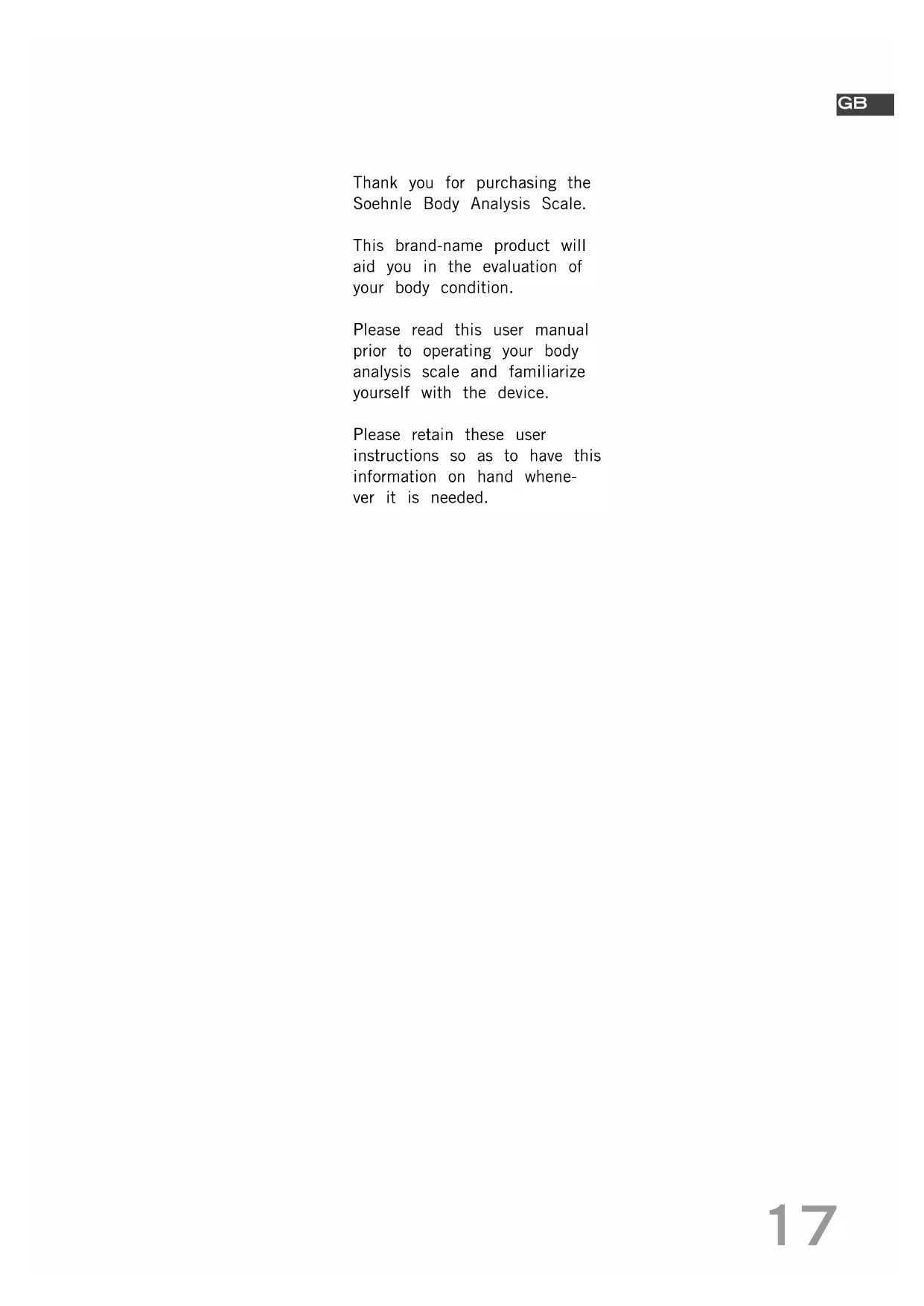 BA63721slimF5_120863_V10.qxd:BA63721slimF5_120863_V9.qxd 05.01.2010 13:20 Uhr Seite 16Thank you for purchasing the Soehnle Body Analysis Scale. This brand-name product will aid you in the evaluation of your body condition. Please read this user manual prior to operating your body analysis scale and familiarize yourself with the device. Please retain these user instructions so as to have this information on hand whene- ver it is needed.