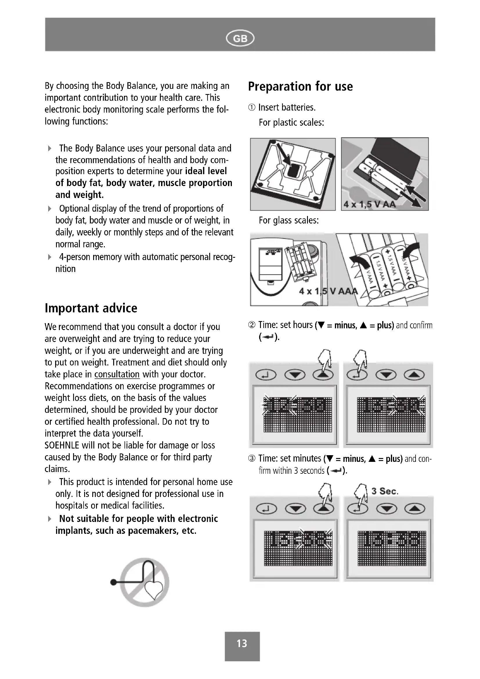 BA_63711_neu_V8.qxd 18.01.2006 13:52 Uhr Seite 1213 By choosing the Body Balance, you are making an important contribution to your health care. This electronic body monitoring scale performs the fol- lowing functions: The Body Balance uses your personal data and the recommendations of health and body com- position experts to determine your ideal level of body fat, body water, muscle proportion and weight. Optional display of the trend of proportions of body fat, body water and muscle or of weight, in daily, weekly or monthly steps and of the relevant normal range. 4-person memory with automatic personal recog- nition Important advice We recommend that you consult a doctor if you are overweight and are trying to reduce your weight, or if you are underweight and are trying to put on weight. Treatment and diet should only take place in consultation with your doctor. Recommendations on exercise programmes or weight loss diets, on the basis of the values determined, should be provided by your doctor or certified health professional. Do not try to interpret the data yourself. SOEHNLE will not be liable for damage or loss caused by the Body Balance or for third party claims. This product is intended for personal home use only. It is not designed for professional use in hospitals or medical facilities. Not suitable for people with electronic implants, such as pacemakers, etc. Preparation for use ➀ Insert batteries. For plastic scales: For glass scales: ➁ Time: set hours (▼ = minus, ▲ = plus) and confirm