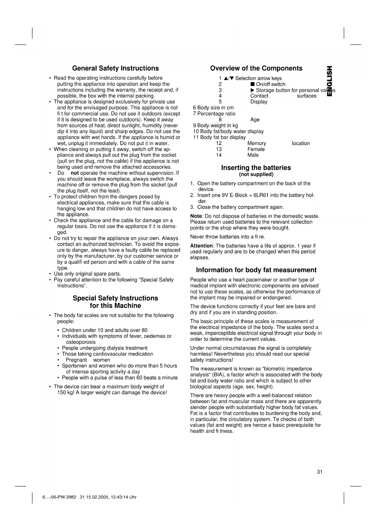 Note: Do not dispose of batteries in the domestic waste. Please return used batteries to the relevant collection points or the shop where they were bought. Never throw batteries into a fi re. Attention: The batteries have a life of approx. 1 year if used regularly and are to be changed when this period elapses. Information for body fat measurement People who use a heart pacemaker or another type of medical implant with electronic components are advised not to use these scales, as otherwise the performance of the implant may be impaired or endangered. The device functions correctly if your feet are bare and dry and if you are in standing position. The basic principle of these scales is measurement of the electrical impedance of the body. The scales send a weak, imperceptible electrical signal through your body in order to determine the current values. Under normal circumstances the signal is completely harmless! Nevertheless you should read our special safety instructions! The measurement is known as “biometric impedance analysis“ (BIA), a factor which is associated with the body fat and body water ratio and which is subject to other biological aspects (age, sex, height). There are heavy people with a well-balanced relation between fat and muscular mass and there are apparently slender people with substantially higher body fat values. Fat is a factor that contributes to burdening the body and, in particular, the circulatory system. Te checks of both values (fat and weight) are hence a basic prerequisite for health and fi tness. 6....-05-PW 2982 31 15.02.2005, 12:43:14 UhrENGLISH