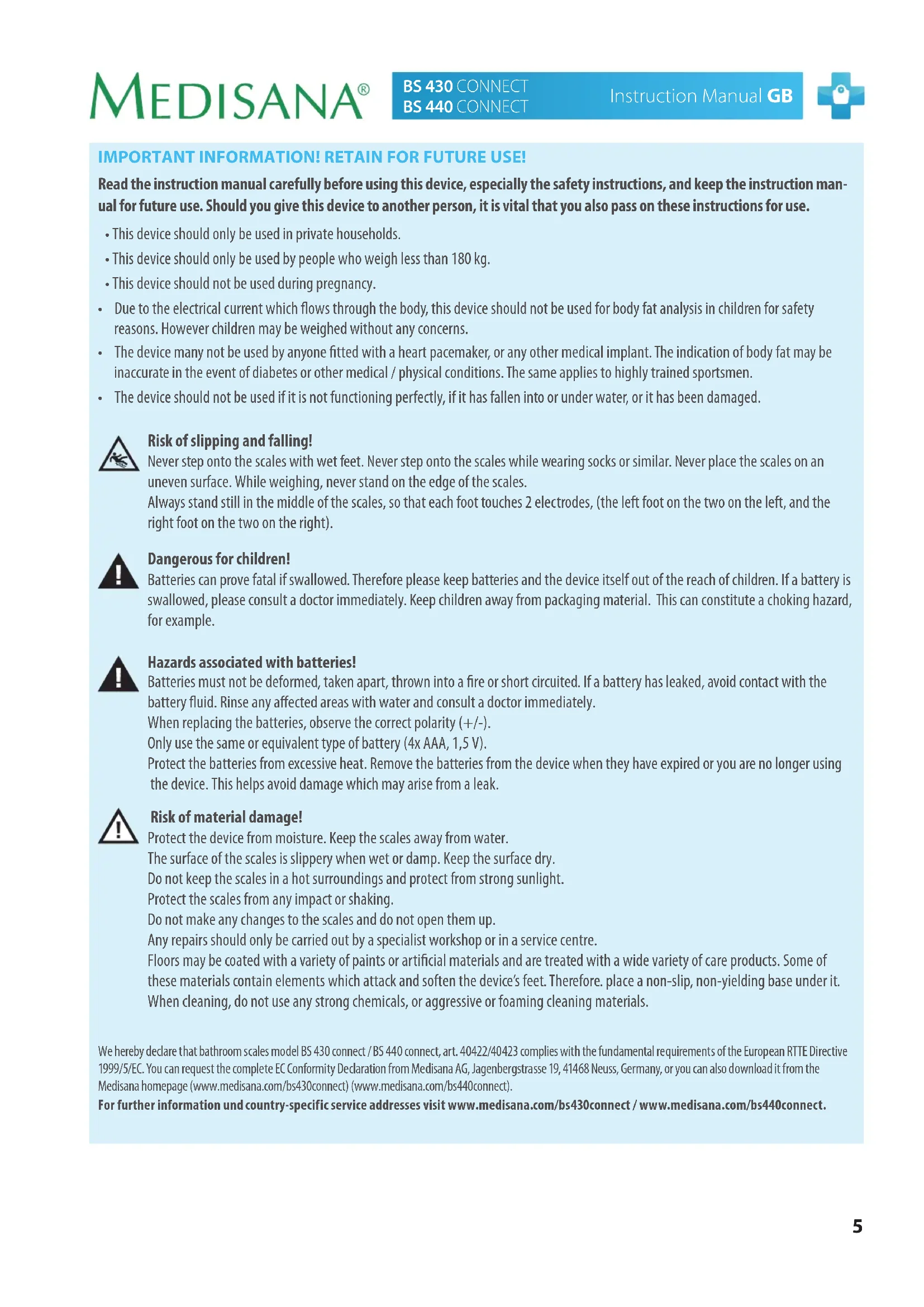- The device should not be used if it is not functioning perfectly, if it has fallen into or under water, or it has been damaged. Risk of slipping and falling! Never step onto the scales with wet feet. Never step onto the scales while wearing socks or similar. Never place the scales on an uneven surface. While weighing, never stand on the edge of the scales. Always stand still in the middle of the scales, so that each foot touches 2 electrodes, (the left foot on the two on the left, and the right foot on the two on the right). Dangerous for children! Batteries can prove fatal if swallowed. Therefore please keep batteries and the device itself out of the reach of children. If a battery is swallowed, please consult a doctor immediately. Keep children away from packaging material. This can constitute a choking hazard, for example. Hazards associated with batteries! Batteries must not be deformed, taken apart, thrown into a re or short circuited. If a battery has leaked, avoid contact with the battery uid. Rinse any aected areas with water and consult a doctor immediately. When replacing the batteries, observe the correct polarity (+/-). Only use the same or equivalent type of battery (4x AAA, 1,5 V). Protect the batteries from excessive heat. Remove the batteries from the device when they have expired or you are no longer using the device. This helps avoid damage which may arise from a leak. Risk of material damage! Protect the device from moisture. Keep the scales away from water. The surface of the scales is slippery when wet or damp. Keep the surface dry. Do not keep the scales in a hot surroundings and protect from strong sunlight. Protect the scales from any impact or shaking. Do not make any changes to the scales and do not open them up. Any repairs should only be carried out by a specialist workshop or in a service centre. Floors may be coated with a variety of paints or articial materials and are treated with a wide variety of care products. Some of these materials contain elements which attack and soften the device’s feet. Therefore. place a non-slip, non-yielding base under it. When cleaning, do not use any strong chemicals, or aggressive or foaming cleaning materials. We hereby declare that bathroom scales model BS 430 connect / BS 440 connect, art. 40422/40423 complies with the fundamental requirements of the European RTTE Directive 1999/5/EC. You can request the complete EC Conformity Declaration from Medisana AG, Jagenbergstrasse 19, 41468 Neuss, Germany, or you can also download it from the Medisana homepage (www.medisana.com/bs430connect) (www.medisana.com/bs440connect). For further information und country-specific service addresses visit www.medisana.com/bs430connect / www.medisana.com/bs440connect.6 Bluetooth Devices General Bluetooth