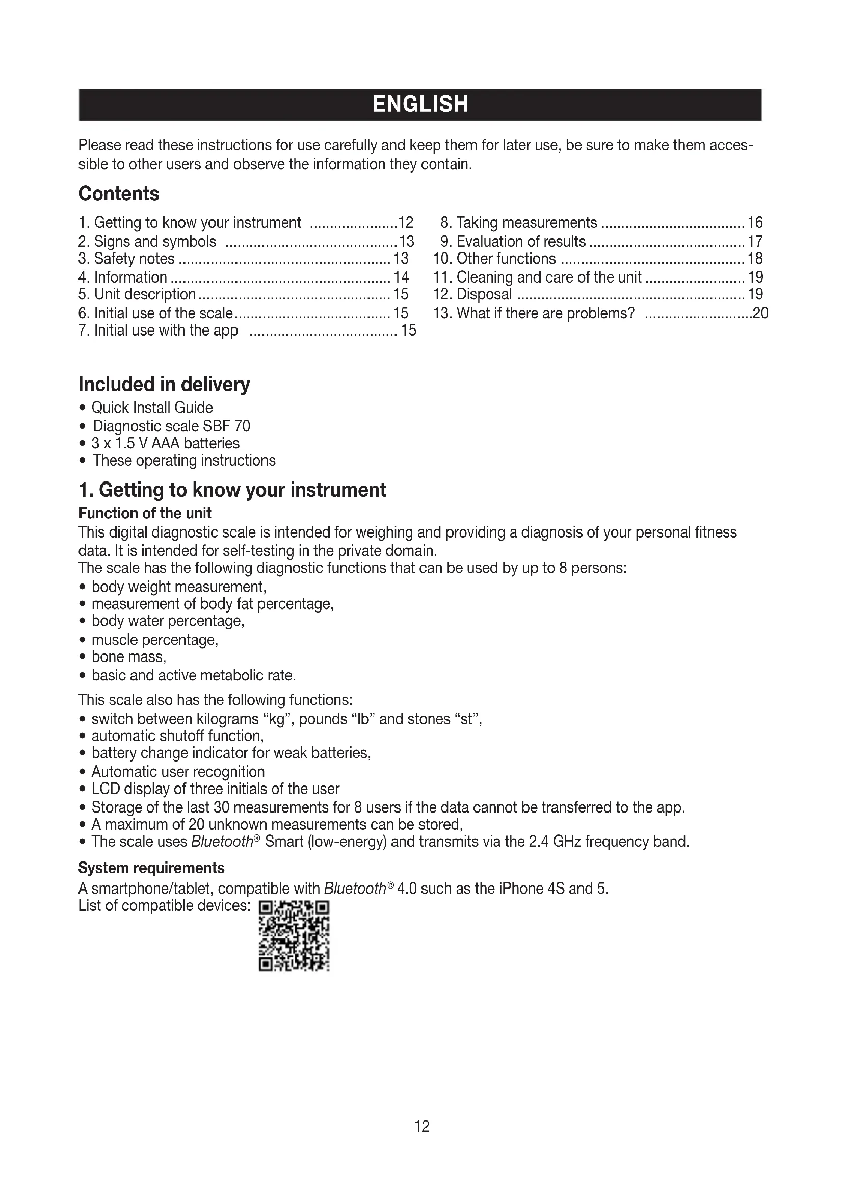Smart (low-energy) and transmits via the 2.4 GHz frequency band. System requirements A smartphone/tablet, compatible with Bluetooth